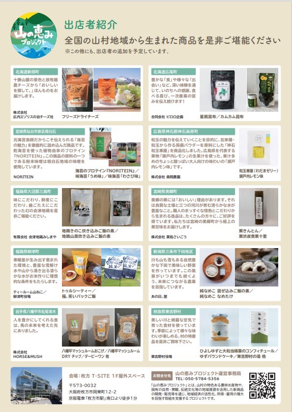 【イベント】山の恵みマルシェ in 枚方T-SITE 特別イベント 枚方T-SITE 1F 屋外スペース 2025年10月10日(金) - 10月12日(日) 「山の恵みプロジェクト」とは、山村の特色ある農林水産物や、 固有の自然・景観、 伝統文化等の地域資源を活用した新商品の開発・販売等を通じ、 地域経済の活性化、 所得・雇用の増大を目指す取組を支援するプロジェクトです。 今回の枚方T-SITEでは山村の地域資源を活用した特産品の販売会を開催します。 会期 2025年10月10日(金)~12日(日) 時間 10:00~18:00*最終日は17:00まで 場所 枚方T-SITE 1F 屋外スペース 主催 山の恵みプロジェクト運営事務局 共催・協力 枚方T-SITE お問合せ 050-5784-5355(10:00-17:00 平日)