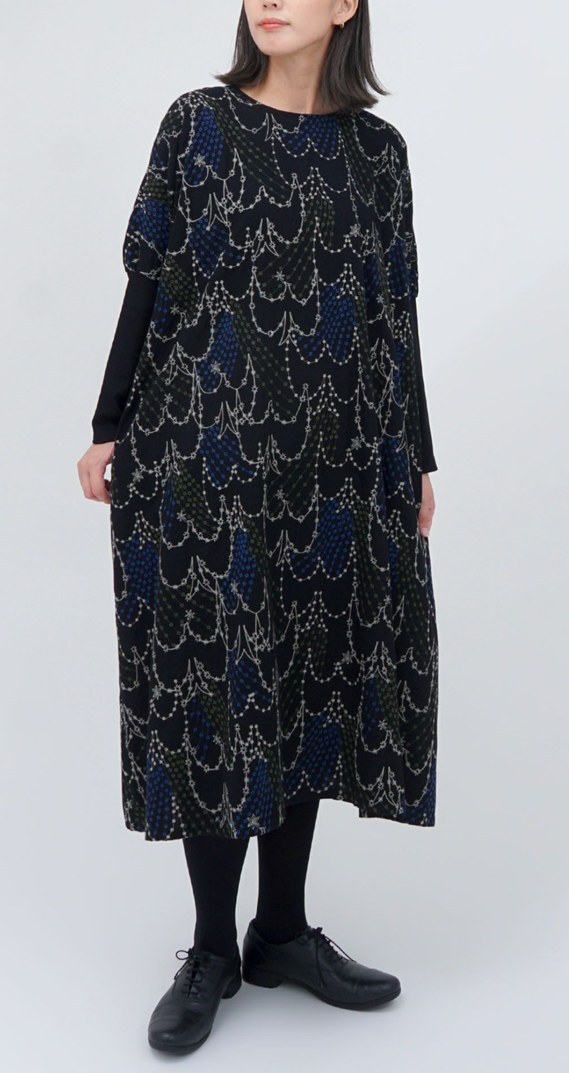幸運を象徴する渡り鳥の【ツバメ】とキラキラとした星のシャワーを表現した、どこか幻想的で繊細な刺繍テキスタイルです。クリスマスや年末年始のお出かけシーズンにピッタリなお洋服です。