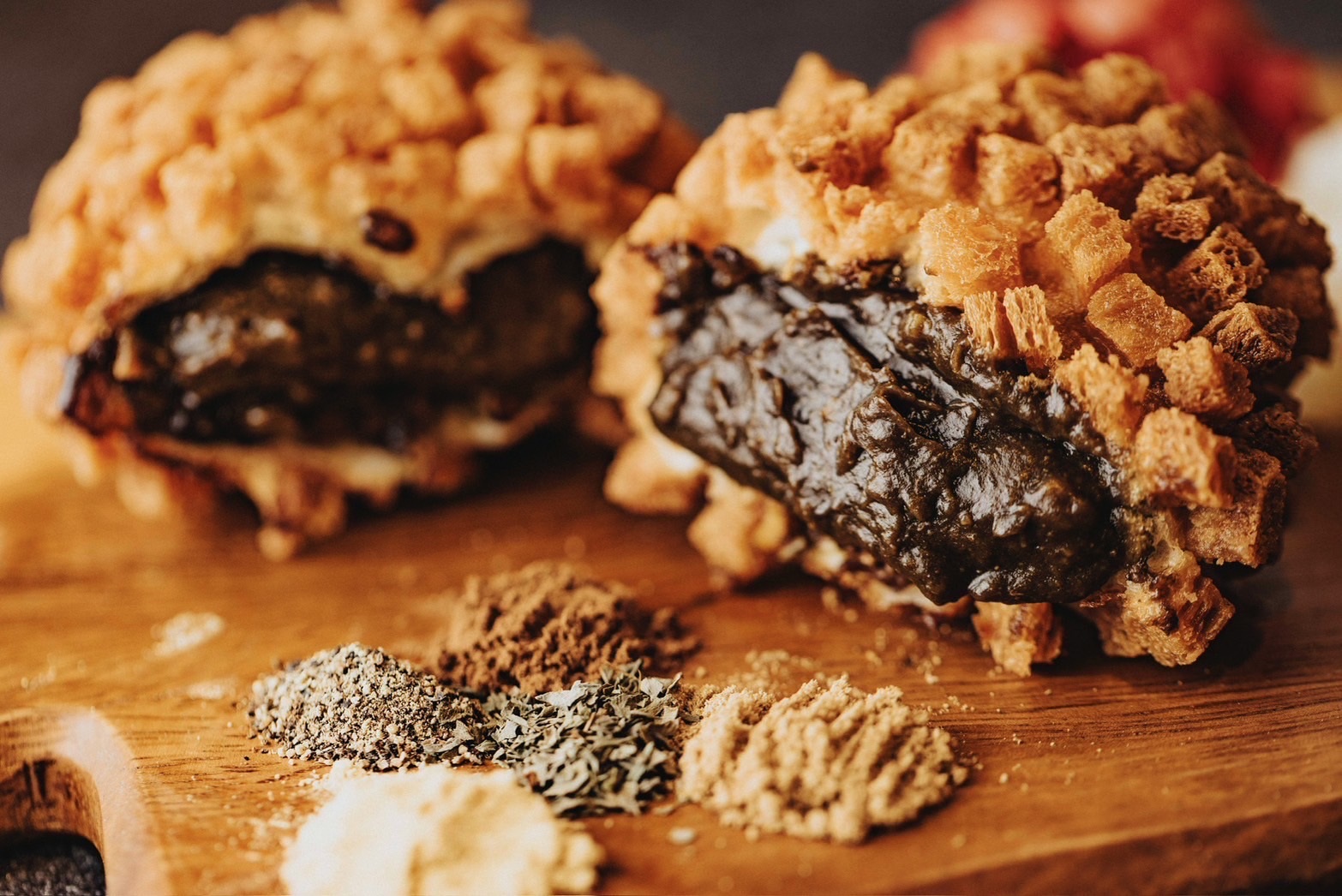 スパイシータコスサンド:牛肉と豚肉の合い挽き肉をスパイシーに炒めて、数種類の穀物(大豆、オートミール、ひまわりの種)が入ったもっちり食パンとトマト食パンではさみました。