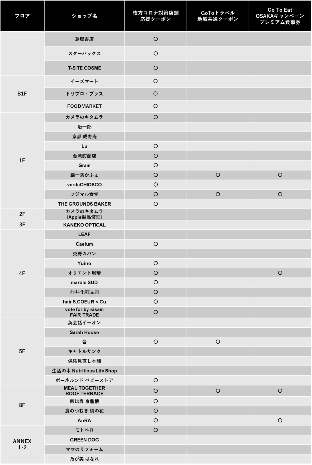 【枚方T-SITE】各種クーポン券対象店舗のご案内 枚方コロナ対策店舗応援クーポンおよび、 Go Toトラベル・Go To Eatキャンペーンにおけるクーポンの利用可能店舗のご案内です。 詳細は各店舗にお問い合わせください。 https://store.tsite.jp/hirakata/floor/shop/ ※催事出店店舗は、枚方市コロナ対策店応援クーポンのみご利用頂けます。