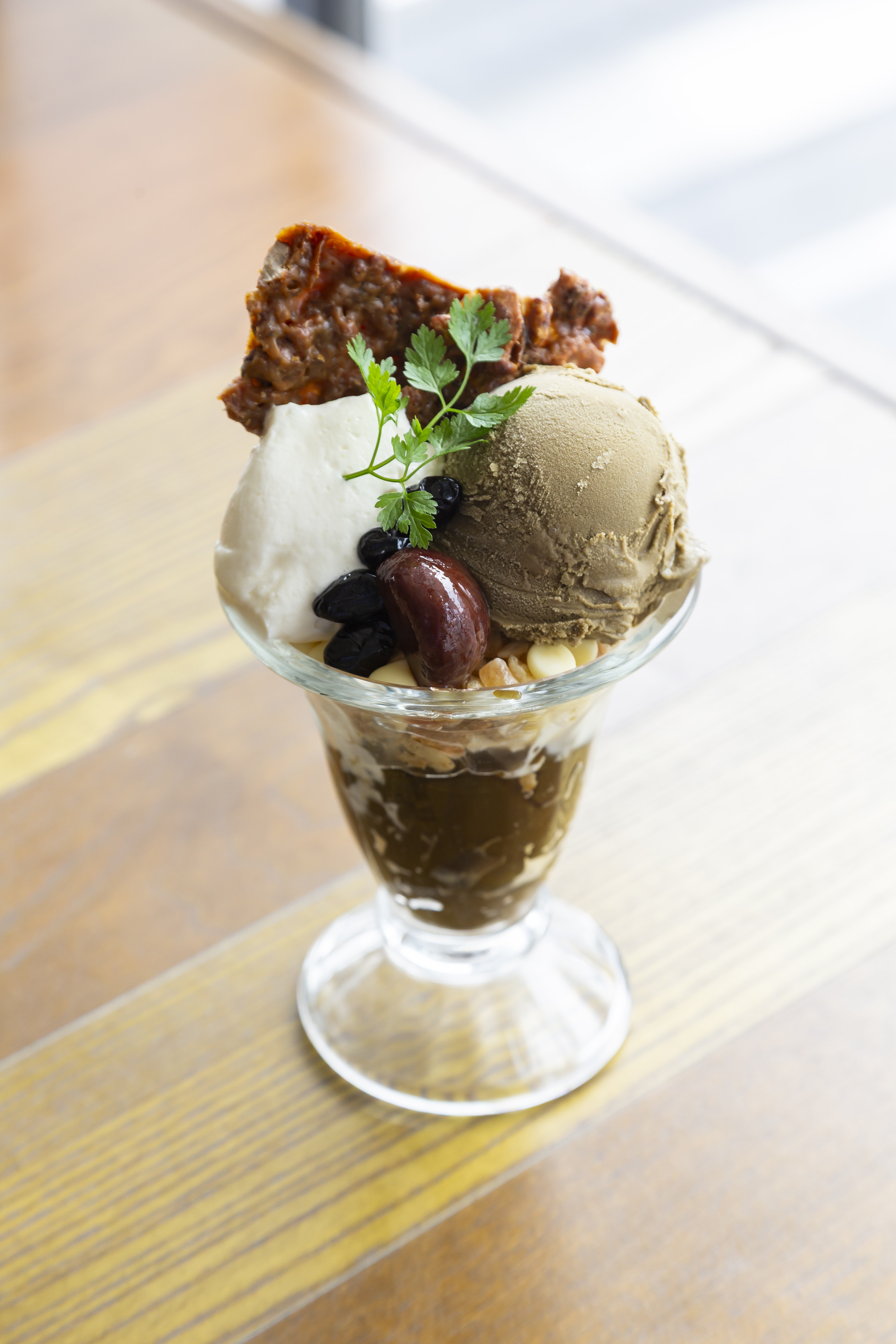 ほうじ茶パフェ1,050円京都和束のほうじ茶を使用した贅沢なパフェ。ホワイトチョコとキャラメルナッツとの相性抜群です。