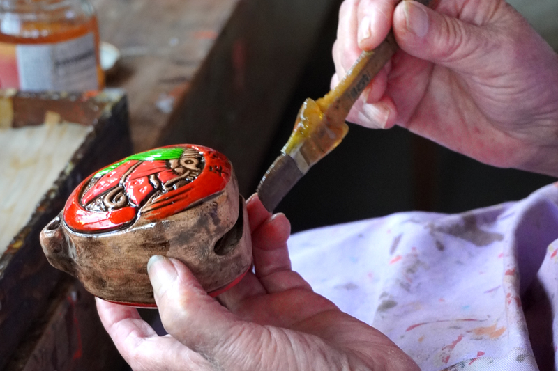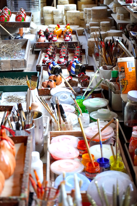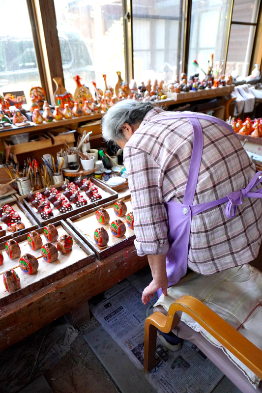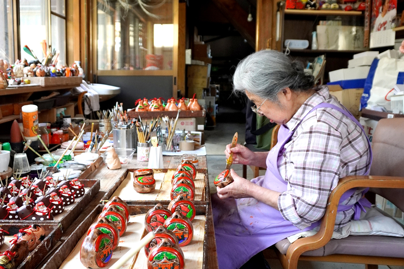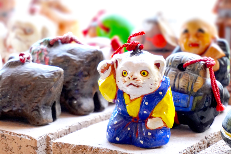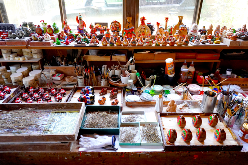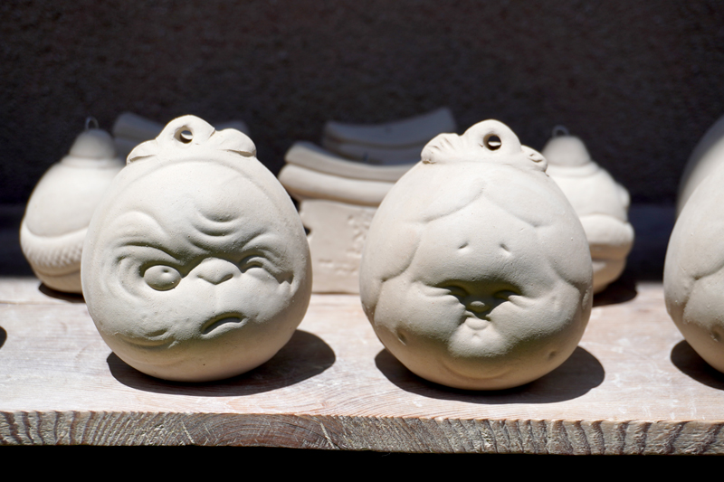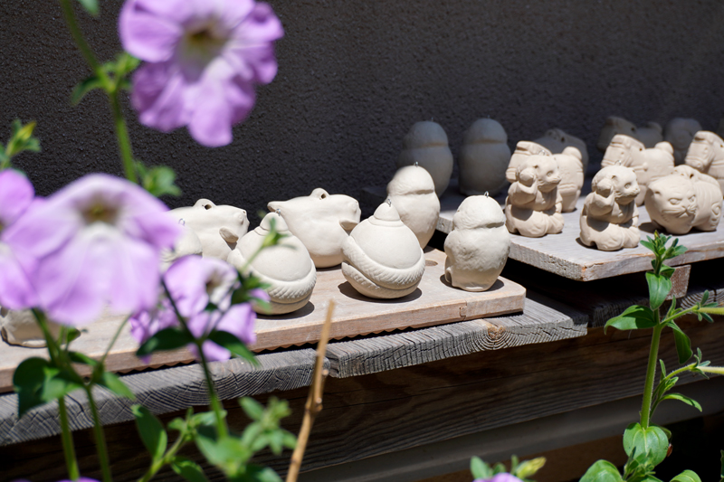 現在は三代目の竹井奎子さんが、ひとりですべてを手作業で作っている。型を作るところから、色つけまですべて手作業になるので、すべての作品は、全く同じものがない。カラコロとなる土鈴の音は、悪いものを払い、幸福や繁栄をもたらすとされている。