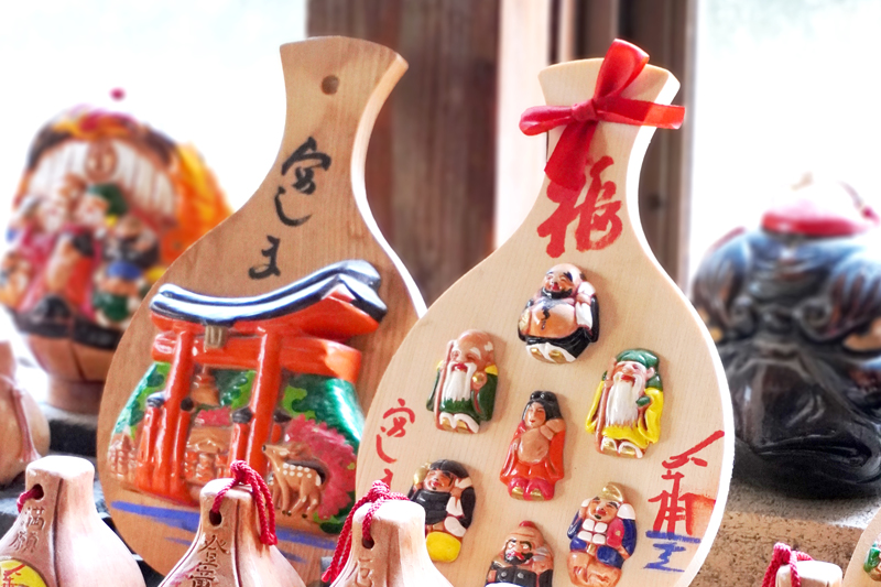 お店の人との会話で作ったもんとかけっこうあるんよ。さっき言った、杓子に七福神を付けたのも最初はね、額に付けとったんよね。そしたらよそが真似をして売れんようになった、そしたらお店の人が、それなら杓子に付けんさいよ、そしたら真似されんよと言われて作ったら今でもずっと売れとるけえね。