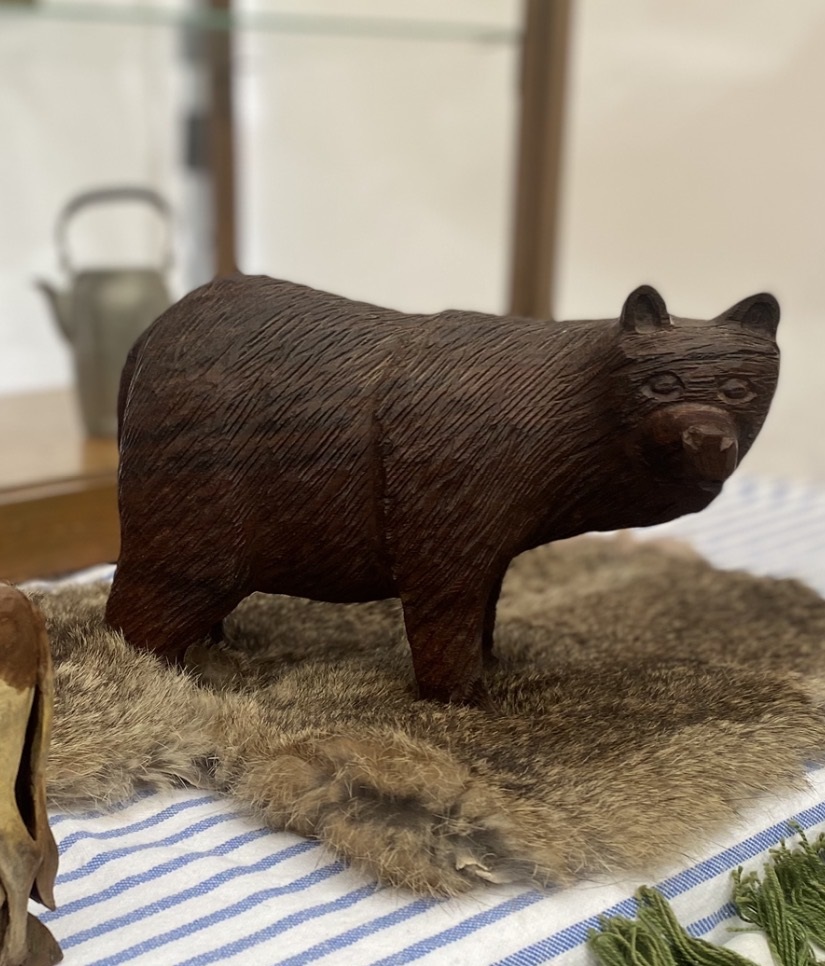誰も見向きもしなかった木彫りの熊。最初に買ったのはこの仕事を始める前、20年くらい前の筥崎宮蚤の市で出会った熊の置き物。どの家庭にもある鮭をくわえた木彫り熊とは違う擬人化した可愛い木彫り熊を密かに集めていました。木彫りに限らず熊の人形もついつい手が出ます。