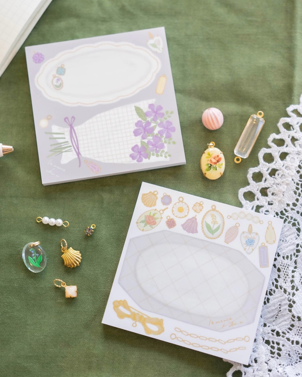西さんの優しいタッチで、レミースのアクセサリーパーツやスミレが描かれたメモ帳です。