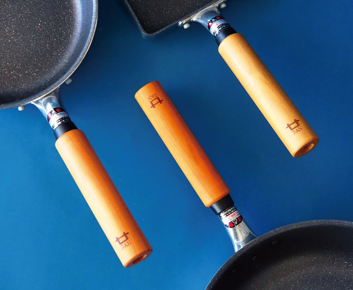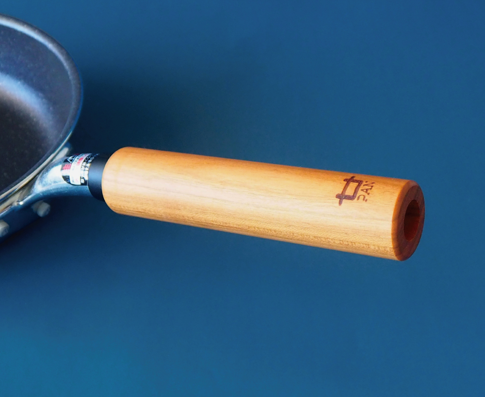 内面は耐久性に優れた3層で焦げ付きにくく金属のヘラ使用も可能です。また側面はフランジ加工(つぼ形状)で変形に対して強い形状となっており、お料理を移しやすい形状となっています。フライパンを使用する際に触れる部分である取っ手は「木のまち廿日市」の桜を使用し、手のひらになじむ安定感のある取っ手に仕上げています。さらに地元廿日市の企業だからこそのサービスとして廿PANは柄を外せるようになっており、痛んできた時には「フライパン皿のみ」のお買い替えが可能です。