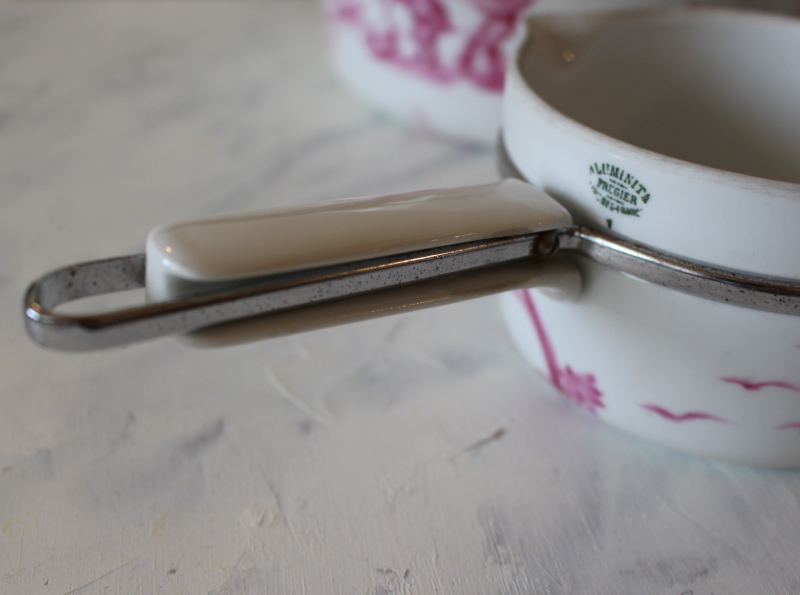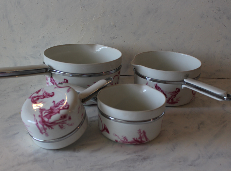 この鍋は1930年代にのみ製造された貴重な物で最近では年々未使用及び状態の良い物の数が少なくなってきており値段もかなり上がってます。主に弊社では片手付きの真っ白なタイプの物を扱っていますが、今回発見したtoile de jouy(トワルドジュイ)柄は本当に数が少なく滅多にお目にかかれない物で弊社でも扱うのは初めてです。しかも使用形跡がないのでデッドストックです。