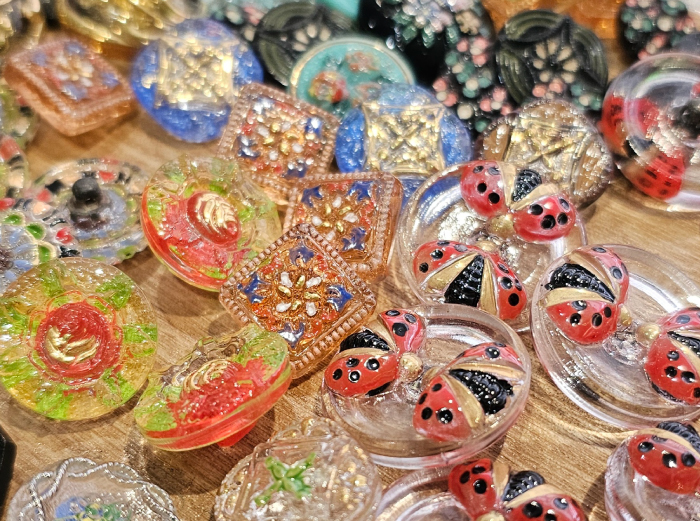 金型に溶かしたガラスを流し込んでプレスした立体模様、虹のように光るラスター仕上げやガラスならではの磨りガラス加工、ハンドペイントをはじめ、全ての工程をひとつひとつ職人の手によって丁寧に手作りされたチェコのガラスボタン。直径わずか数センチのボタンに、花や星、虹色の輝きがぎゅっと詰まっているのです。