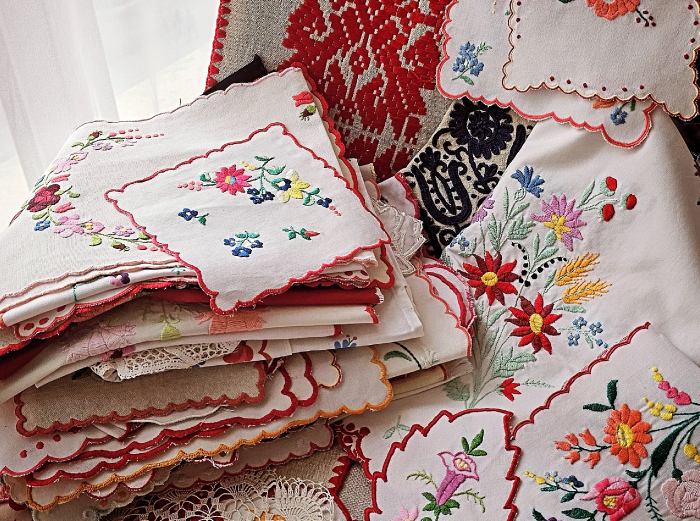 特徴は、花をびっしりと咲かせるようなデザインと、本数どりを多くした刺繍糸でふっくら立体的に刺したサテンステッチの美しい仕上がり。民族衣装のブラウスやエプロン、テーブルクロスやクッションカバーなど、暮らしのあらゆる場面を華やかに演出してきました。