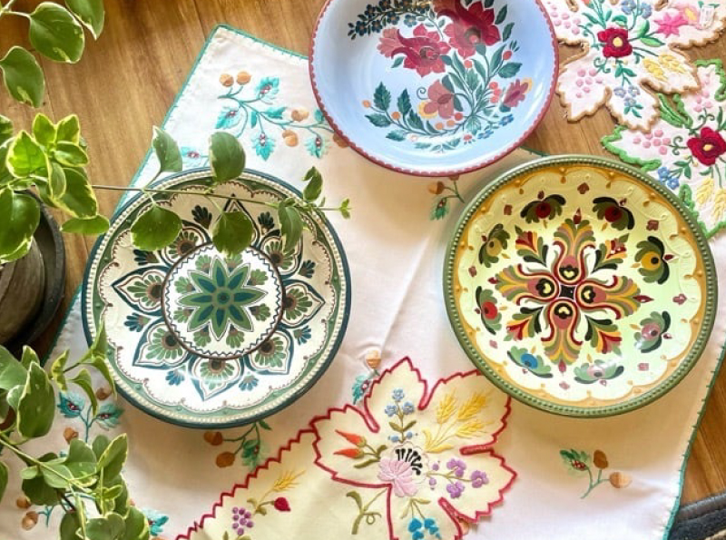 今回当店はそんなカロチャ刺繍を様々なサイズやバリエーションでご用意しております。また、そんな刺繍柄をモチーフにした手描きの飾り皿もございます。ハンガリーの暮らしを彩った、手作りのアイテムをぜひお楽しみください。