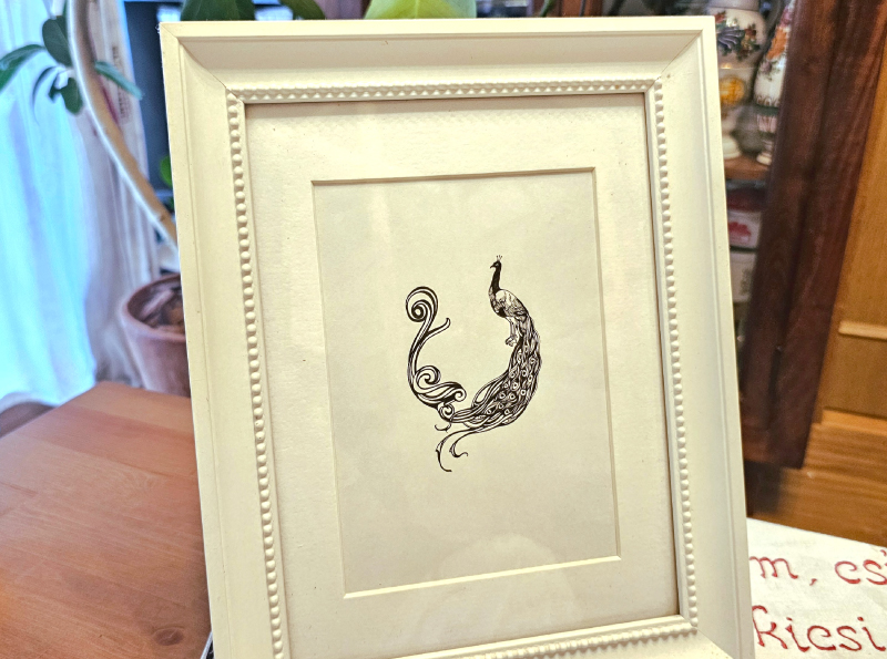 彼女は以前同じ企業に勤めていた、グラフィックデザイナーでした。仕事や作る作品がいつも素晴らしいので、ずっと歳上の先輩だと思っていたら同年代で…仲良くなり、家も行き来するようになった頃、この絵に出会いました。この孔雀の絵、線の流れがしなやかで、羽の模様も丁寧に描き込まれていて、見ていると自然と目が引き込まれ…シンプルな構図なのに存在感があって、繊細なのに強さを感じるところに惹かれました。本人からしたらたくさん描いたうちの1枚だったり練習作だったりするのかもしれませんが…ずっとお気に入りでもう何年も我が家の壁を彩っています。