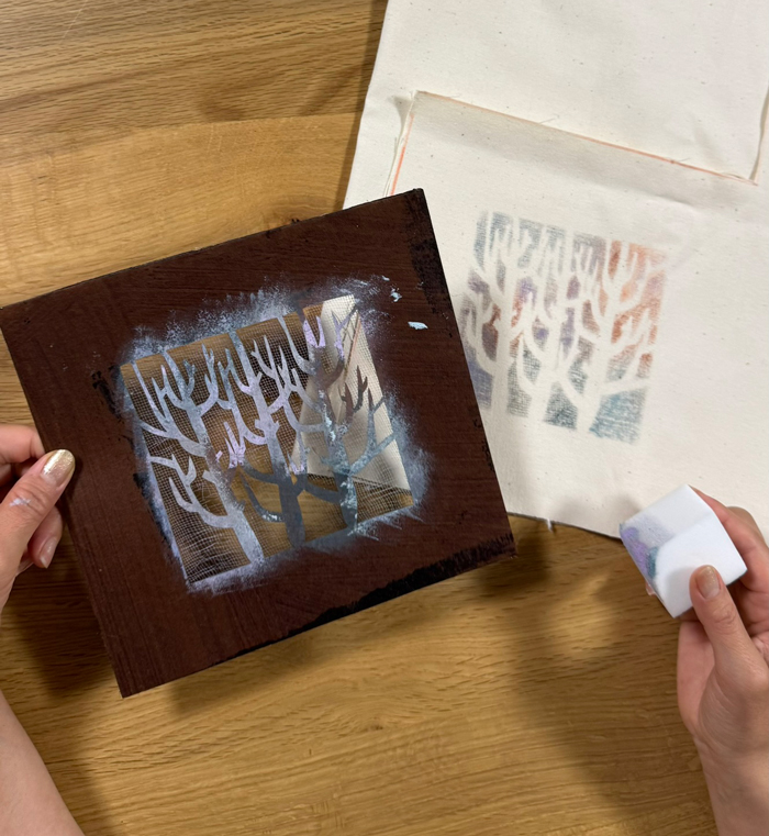 絹紗(きぬしゃ)という薄いメッシュ状の布を、カシュー(塗料)で張り込み、その完成した型紙(はがきサイズ)を使って布に色を付けていきます。ステンシル法、捺染法などご家庭でもできる手法も新里さんから教えていただきます。