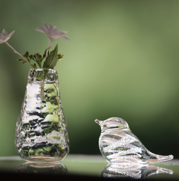 宮島の対岸の山中で1300℃で溶かしたガラスをパイプで巻き取り、「毎日使いたくなる普段着の器を」そんな思いでガラスに息を吹き込んでいます。