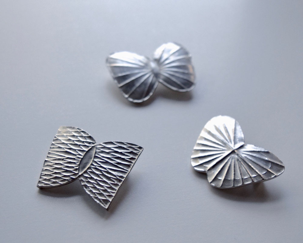 金属のようで実は軽い陶磁器の銀彩ブローチです。硬質磁器を3回以上焼成し、銀を焼き付けて作ります。薄地のブラウス、Tシャツから厚地のコートまで装いをお楽しみいただけます。静岡の山里で心の中で移りゆくイメージを愉しみながら自由な形を作りました。どうぞお手に取ってご覧ください。