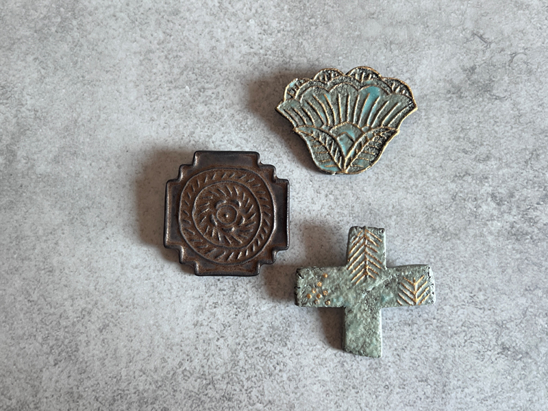 焼き物でブローチや器を制作しています。ブローチはインドのブロックプリントやペルシャ絨毯などの模様を参考に、アンティークのような古びた雰囲気を大切にしながらひとつひとつ形作りました。素材が陶ではありますが、可能な限り薄く作っていますので「思ったよりも軽い」との評判をいただいています。薄いリネンやニットのお洋服でもひきつらない軽さです。ぜひ、手に取ってみてください。