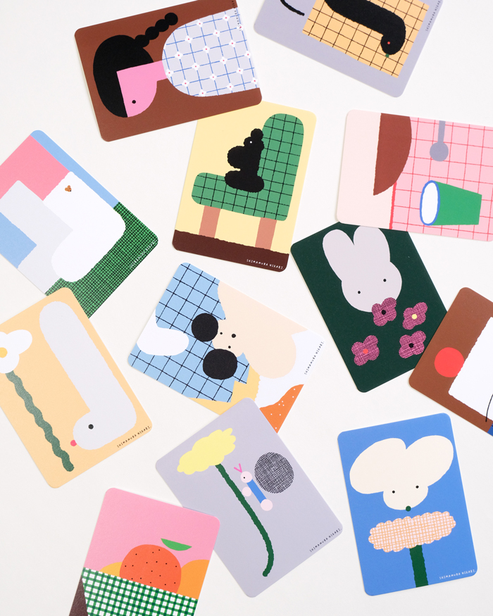 ポストカードやステッカー、ハンカチ、トートバッグなど、目が合うとちょっぴりごきげんになれる、色とりどりの雑貨たちが並びます。
