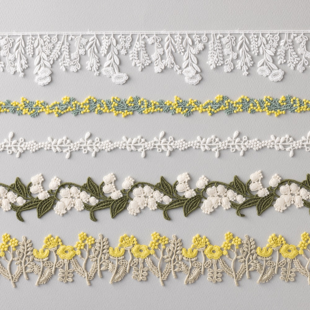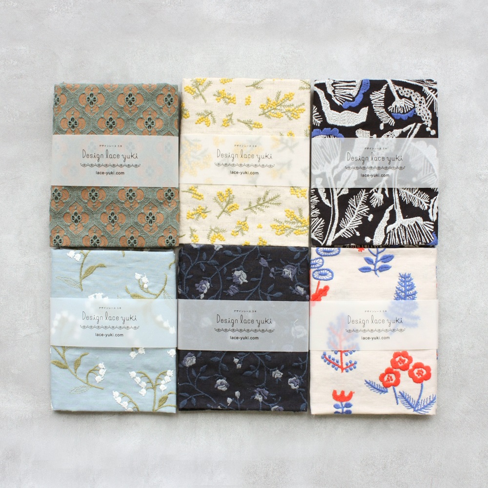 国産のレース機でゆっくり織り上げる手刺繍のようなレースたち。クラシックで繊細なレースから、気軽に使えるユーモアなモチーフ、刺繍生地まで、デザインレースユキによる広がるレースの世界をお楽しみください。
