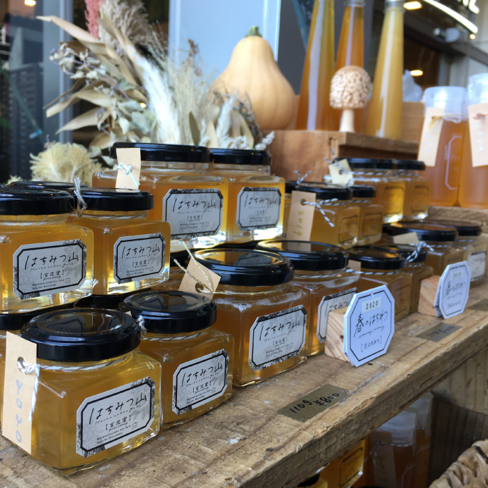 安佐北区の山の中にある養蜂場です。はちみつはオーガニックの生はちみつと熟成はちみつ、酵素の生きたはちみつです。春と秋、熟成とフレッシュなはちみつ、10年ものの熟成はちみつと、それぞれ味と香りに個性があるので是非食べ比べてみてください。野菜や果物ははちみつの蜜源にもなっていて農薬や化学肥料は使っていません。8月はブルーベリーと夏野菜とシモンの葉っぱとカボチャをお持ちします。