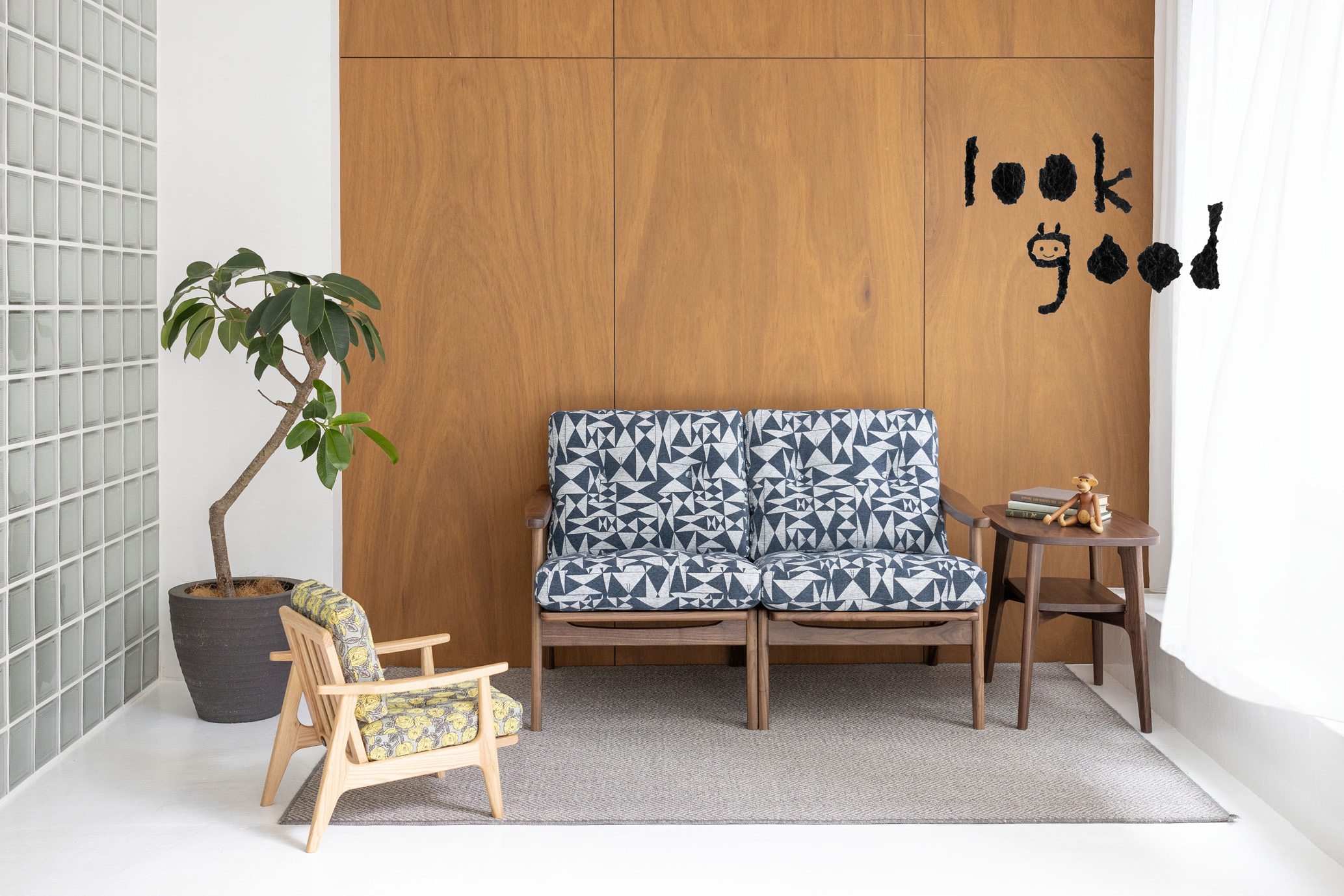 今年のタイトル「look good」には、自然体で自分の気持ちに正直に、暮らしに寄り添う一脚を選ぶ楽しさと大切さをそれぞれの感性で見つけてほしい、という想いが込められています。会場にはジャガード織りのファブリック “perhonen puzzle” “thoroughbred” “rosy” を張った、特別仕様のMARUNI60フレームチェアとミニサイズが登場。親子で並んで座り、穏やかな時間を過ごす、そんなやさしい日常が思い浮かびます。