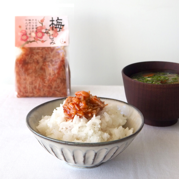 えのき茸、鰹節、梅肉を使い、リンゴピューレでほのかに甘くさっぱり仕上げました。ごはんのお供、パスタ、お肉料理、サラダにも合います。