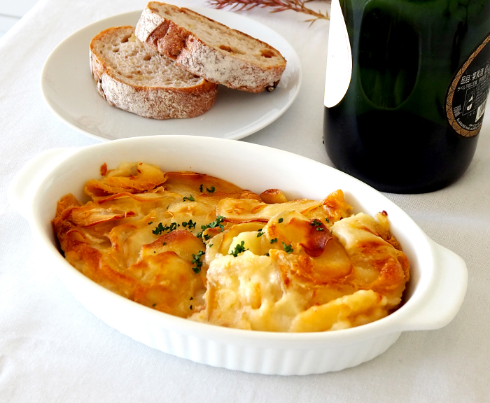 北海道のじゃがいもをミルフィーユ状に重ね、クリーミーなホワイトソースを使って焼き上げました。