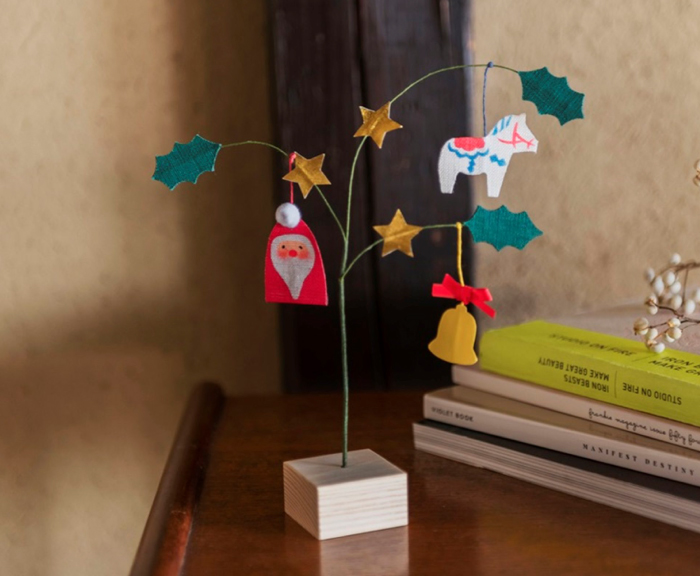 手績み手織り麻で作ったサンタクロースやクリスマスベル、お星さまを飾りつけ、枝先にひいらぎをあしらった卓上サイズのお飾りです。上部に吊り下げている北欧の伝統工芸品「ダーラナホース」をモチーフにしたオーナメントは、幸せを運ぶ「幸運の馬」ともいわれています。世界各国でにぎわう日、華やかにお飾りをしつらえ、みんなで楽しく過ごしてみてはいかがでしょうか。
