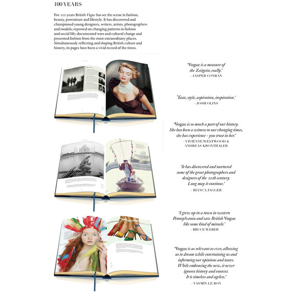 過去のアーカイブから厳選された500点のイメージと、写真やイラスト、インタビュー、今までUKヴォーグに関わってきたクリエイターたちからの100ものコメントなどにより、その当時の時代性や背景が解説されています。