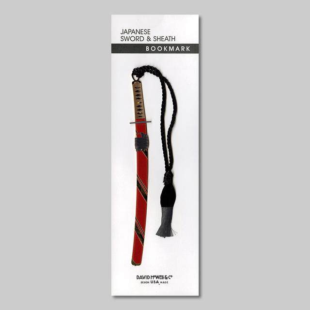 鞘の部分が薄い金で螺旋を施した赤色の漆から作られた刀(安土桃山時代)を模したブックマーク。細部も美しく表現されています。