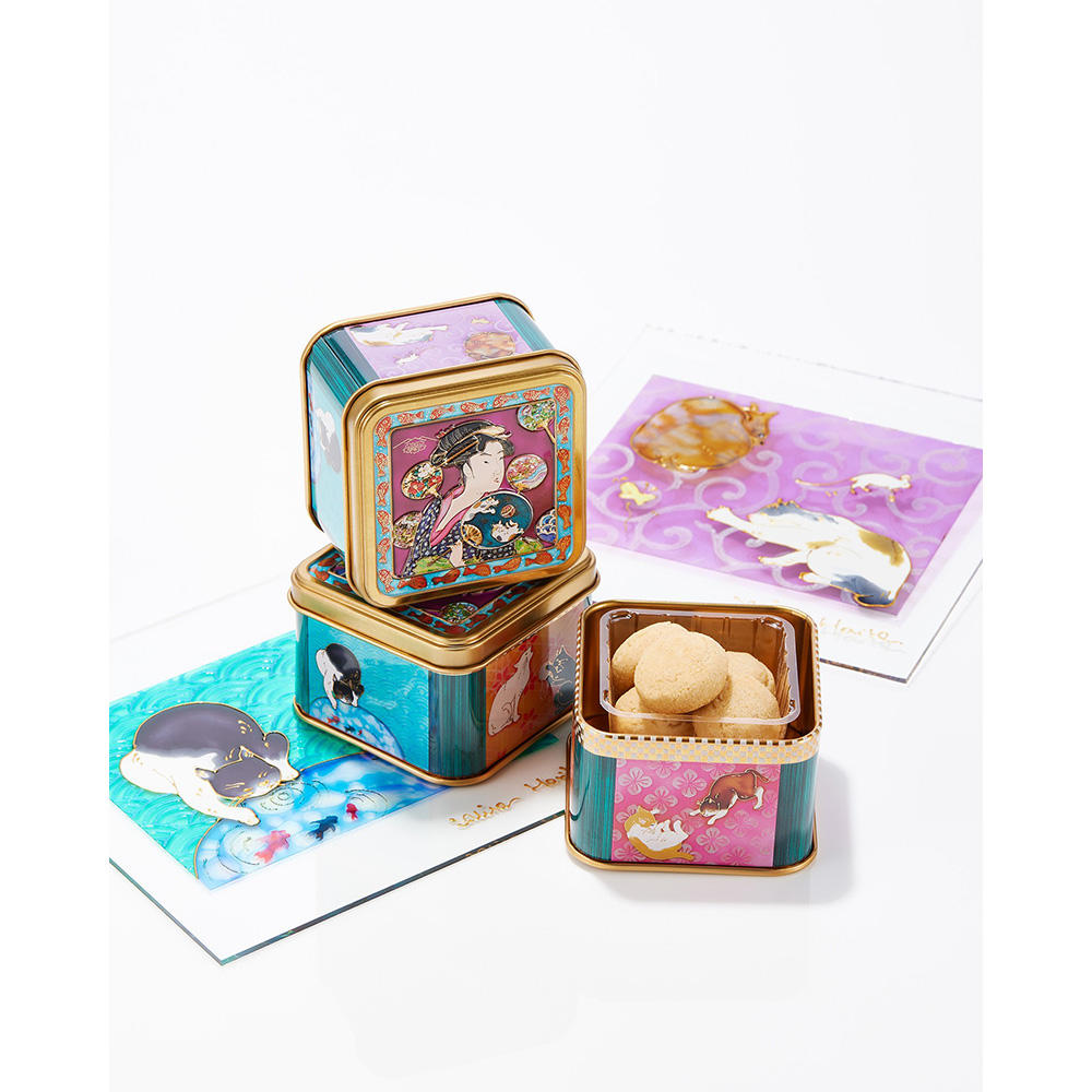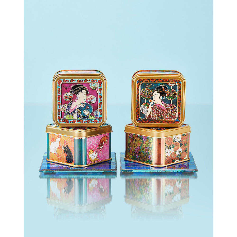 グラスペイントアーティストAlisa Horitaさんが描く、まるでステンドグラスのようにキラキラ輝くガラス絵×浮世絵 『お江戸ネコ缶』。蓋面には喜多川歌麿の「高島おひさ」を、側面には日本の四季とお江戸ネコをガラス絵で描きました。