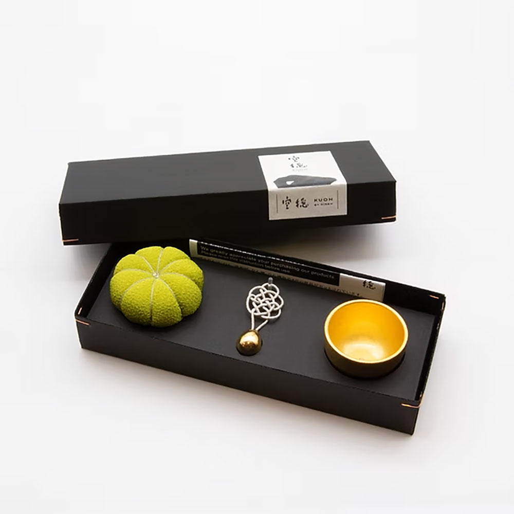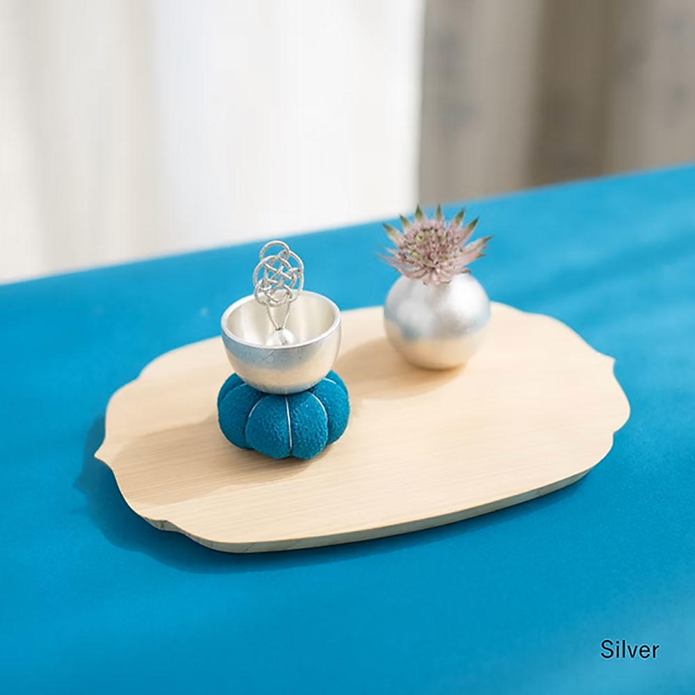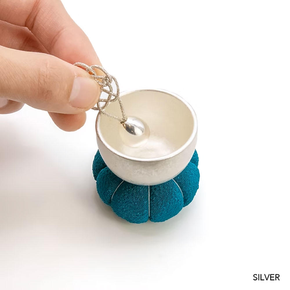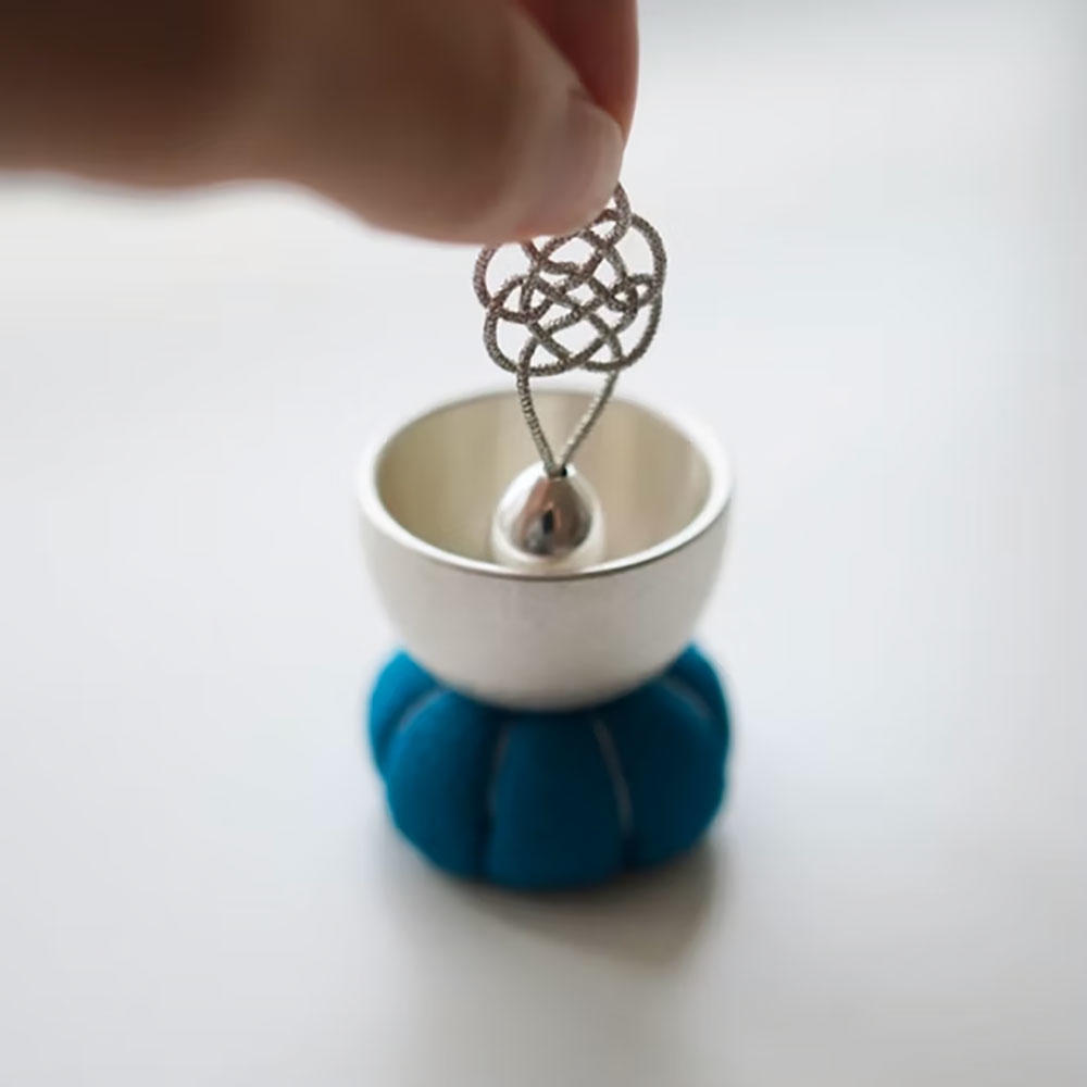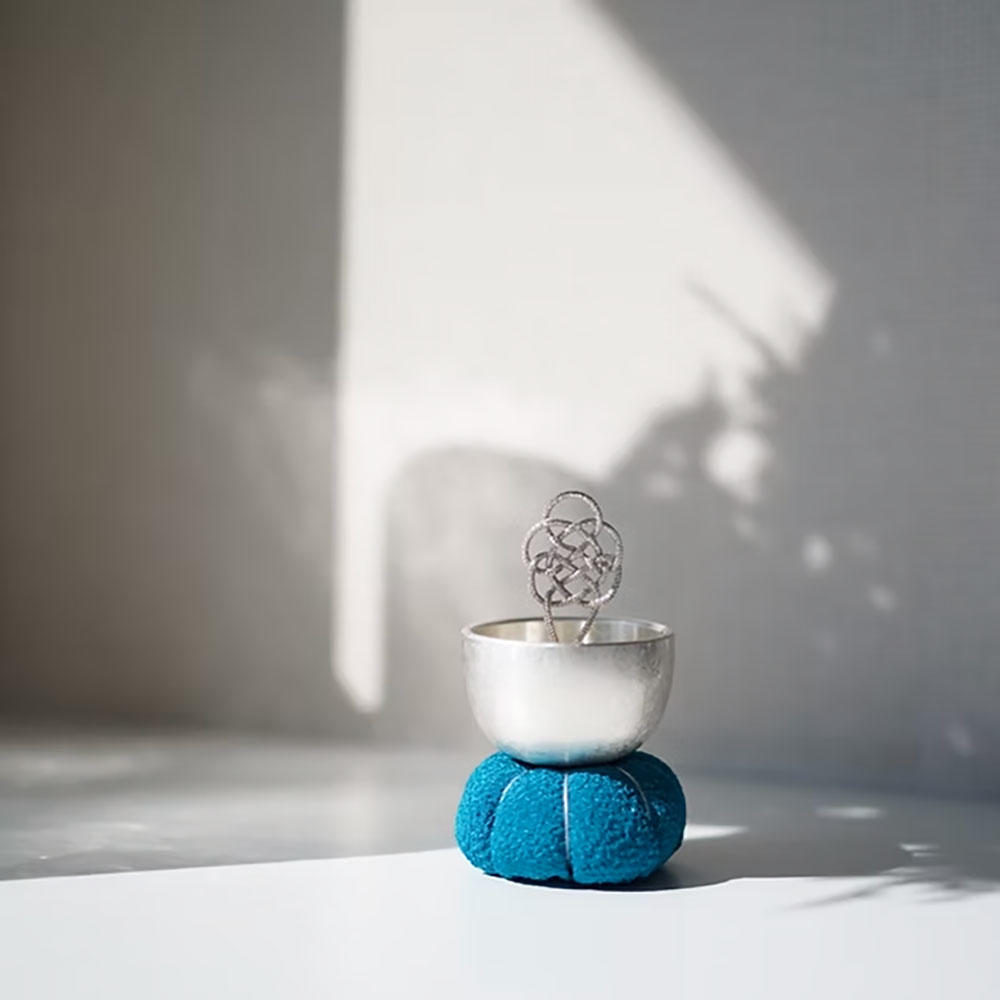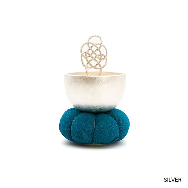 座禅で使われる座布に佇む「ざふりん」から響く澄んだ音色は、日常に癒しのときを添えてくれるでしょう。健やかな日々を願う吉兆結びの「亀結び」の組紐りん棒は、おりんの底の磁石の力ですっと自立します。おりんの中に収めると亀結びがちょこんと顔を出すかわいいらしい姿になります。鳴らしてすぐに中に収めても音色が消えることはありません。