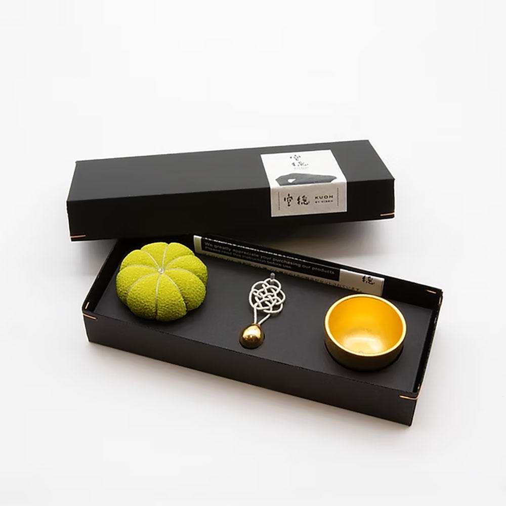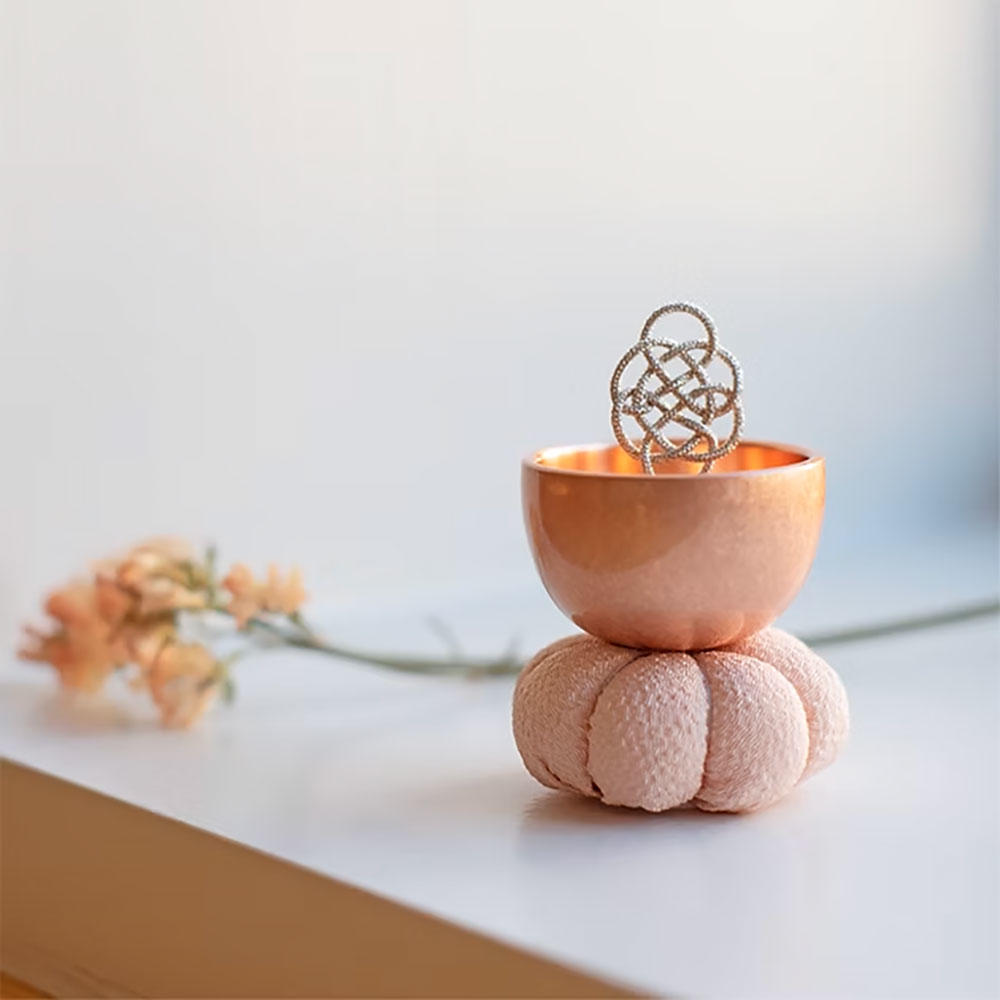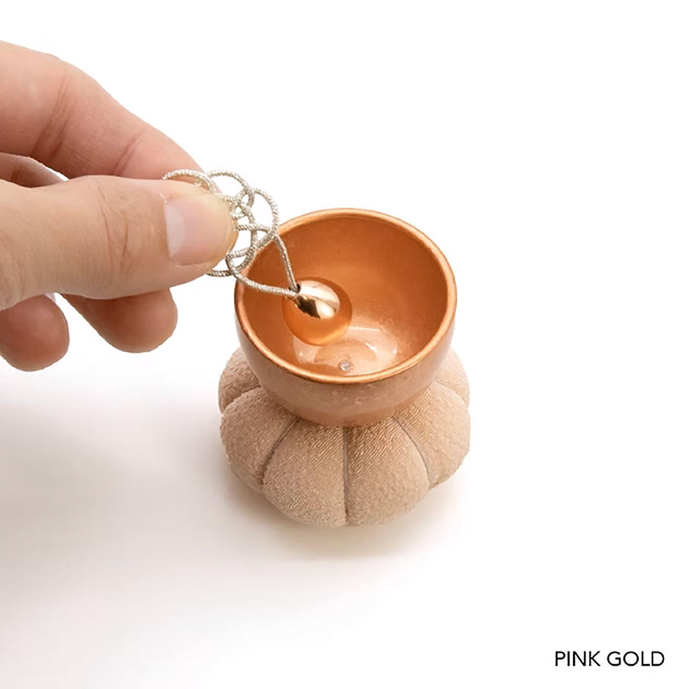 座禅で使われる座布に佇む「ざふりん」から響く澄んだ音色は、日常に癒しのときを添えてくれるでしょう。健やかな日々を願う吉兆結びの「亀結び」の組紐りん棒は、おりんの底の磁石の力ですっと自立します。おりんの中に収めると亀結びがちょこんと顔を出すかわいいらしい姿になります。鳴らしてすぐに中に収めても音色が消えることはありません。