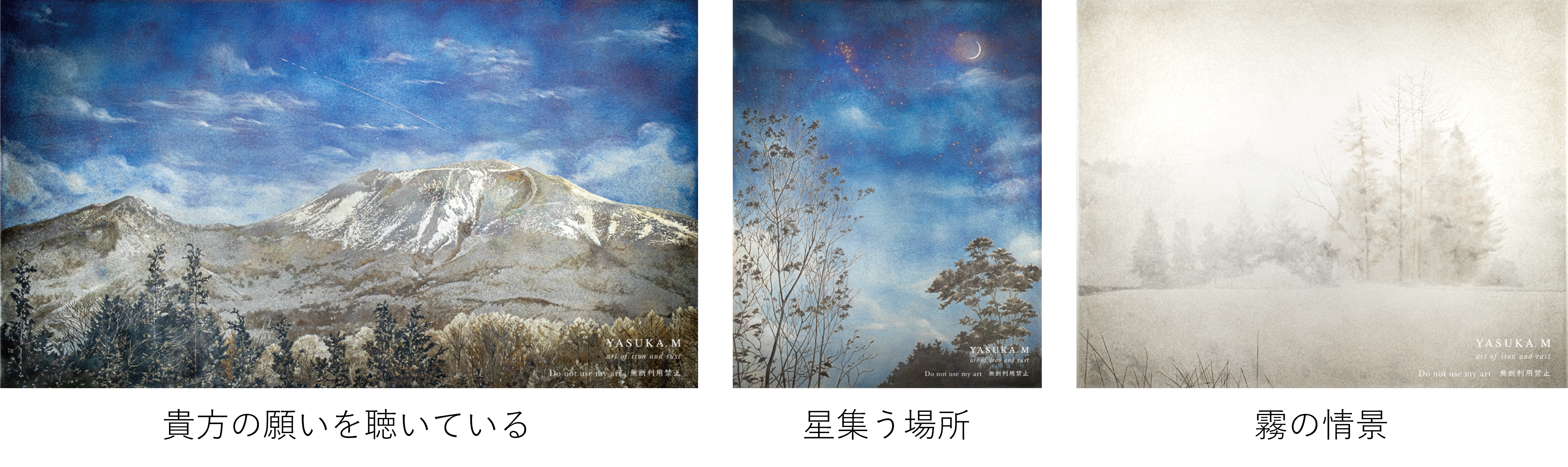 独自の手法で鉄を酸化させ、錆の濃淡のみで作品を創るYASUKA.M。本展では、軽井沢Tサイトの開業に合わせて制作された「楽園 ー Eden ー」をはじめ、軽井沢の自然からインスピレーションを受けた数々の作品が展示されます。また、軽井沢限定の『鉄錆の栞』や、本展に合わせて新たに制作された軽井沢の風景を描いた作品の複製画も展示・販売いたします。