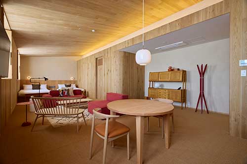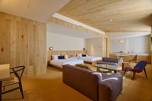 エントランスを抜けると、旅の緊張をほどくように暖炉の炎が揺れ、自然の温もりに満ちた空間が広がります。客室を含めたすべてのデザインは、イギリス生まれのホームファニシングショップ、ザ・コンランショップが監修。巨匠たちの名作から現代の優れたプロダクト、そしてヴィンテージ品まで。丁寧に選び抜かれた家具や小物でコーディネートされた空間には、随所に軽井沢ゆかりのアーティストたちの作品が配され、この土地の原風景と響きあっています。