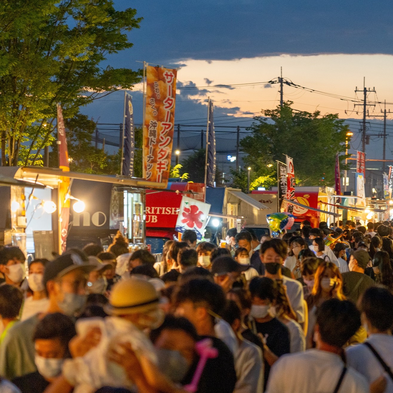 からあ、かき氷、りんご飴、ビール…食欲をそそるグルメやスーパーボールすくいなど夏祭りの気分を味わえる円いい屋台が勢ぞろい。この2日間限りのにぎやかなひとときを満喫しよう!