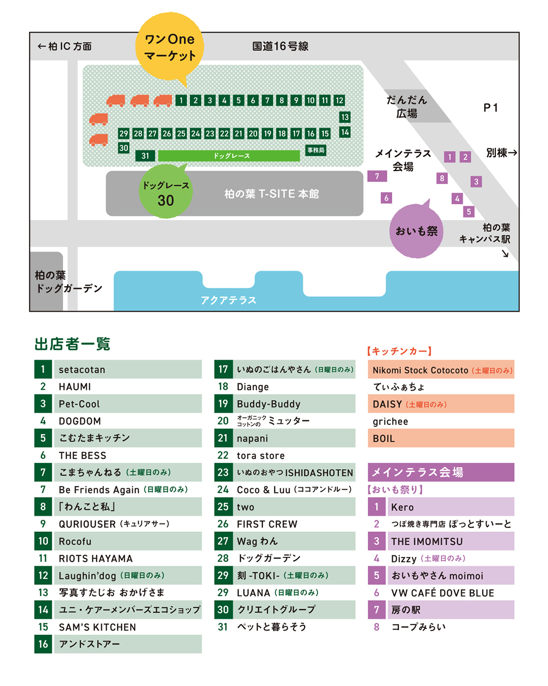 【12/14開催時間変更】ワンOneマーケット~ショップリスト~ 特別イベント|イベント|ドッグ 柏の葉T-SITE P2駐車場、メインテラス 2025年12月13日(土) - 12月14日(日) 12月14日(日)開催の第21回ワンOnedayは、午前中の雨天の影響により、開催時間を変更いたします。 【12月14日(日)開催時間】 12:00~17:00 ※尚、開催後の天候により、ドッグレースは止むを得ず中止とさせていただく場合がございます。 予めご了承くださいますようお願い申し上げます。 SHOP FOOD Special Thanks SHOP 土 日 わんこと私 おやつ・雑貨・犬の似顔絵・はんこの受注 ↗Instagram 日 Be Friends Again アパレル ↗Instagram 土 日 Buddy-Buddy おやつ・ごはん ↗︎HP ↗Instagram 土 日 Coco&Luu オリジナルグッズ・アパレル ↗︎HP ↗Instagram 土 日 DOGDOM アニマルハーブボール体験 ↗︎HP ↗Instagram 土 日 FIRST CREW ごはん・おやつ ↗︎HP ↗Instagram 日 Laughin'dog ドッグスリング ↗︎HP ↗Instagram 土 日 Diange おやつ ↗︎HP ↗Instagram 土 日 HAUMI アパレル、雑貨 ↗︎HP ↗Instagram 日 LUANA 犬具・アパレル ↗︎HP ↗Instagram 土 日 napani ごはん・おやつ ↗︎HP ↗Instagram 土 日 Pet-Cool ごはん・ケア用品 ↗︎HP ↗Instagram 土 日 QURIOUSER 犬具・雑貨 ↗︎HP ↗Instagram 土 日 RIOTS HAYAMA ケア用品 ↗︎HP ↗Instagram 土 日 setacotan おやつ・ごはん・雑貨 ↗︎HP ↗Instagram 土 日 THE BESS アパレル・雑貨 ↗︎HP ↗Instagram 土 日 two おやつ・ごはん ↗Instagram 土 日 アンドストアー アパレル ↗Instagram 土 日 Rocofu おやつ・雑貨・犬具 ↗︎HP ↗Instagram 土 日 tora store 知育トイ ↗Instagram 土 日 いぬのおやつISHIDASHOTEN おやつ ↗Instagram 日 いぬのごはんやさん ごはん ↗Instagram 土 日 オーガニックコットンのミュッター アパレル ↗︎HP ↗Instagram 土 日 Wagわん おやつ・ごはん・雑貨 ↗︎HP ↗Instagram 土 こまちゃんねる 似顔絵・雑貨 ↗︎HP ↗Instagram 土 日 こむたまキッチン おやつ ↗︎HP ↗Instagram 土 日 写真すたじお おかげさま フォトブース撮影会 ↗Instagram 土 日 SAM'S KITCHEN(ドクター・わん) おやつ ↗Instagram 土 日 ユニ・ケアーメンバーズエコショップ 雑貨 土 刻-TOKI- ↗︎HP ↗Instagram 土 日 柏の葉Dog Garden 新規登録受付 ↗︎HP FOOD 土 日 BOIL ローストビーフ丼 ↗Instagram 土 DAISY ハンバーガー、サンドイッチほか ↗Instagram 土 日 grichee フォカッチャサンド、ワンちゃんおやつほか ↗Instagram 土 Nikomi Stock Cotocoto 牛すじと青森県産極太ごぼうの煮込み ↗Instagram 土 日 てぃふぁちょ だし巻き玉子焼き ↗Instagram おいも祭 - 同時開催 - 土 日 VW CAFE DOVE BLUE ↗Instagram 土 日 おいもやさんmoimoi ↗Instagram 土 日 つぼ焼き専門店ぽっとすいーと ↗Instagram 土 日 房の駅 ↗Instagram 土 日 Kero ↗Instagram 土 日 THE IMOMITSU ↗Instagram 土 Dizzy ↗Instagram Special thanks 土 日 クリエイトグループ 蓄電池・太陽光 土 日 生活協同組合コープみらい 食品、ペットフードほか \ メインページはこちら! / 時間 10:00-16:00 場所 柏の葉T-SITE P2駐車場、メインテラス 協賛 生活協同組合コープみらい、クリエイトグループ株式会社 主催 柏の葉T-SITE 問合せ 04-7197-1400