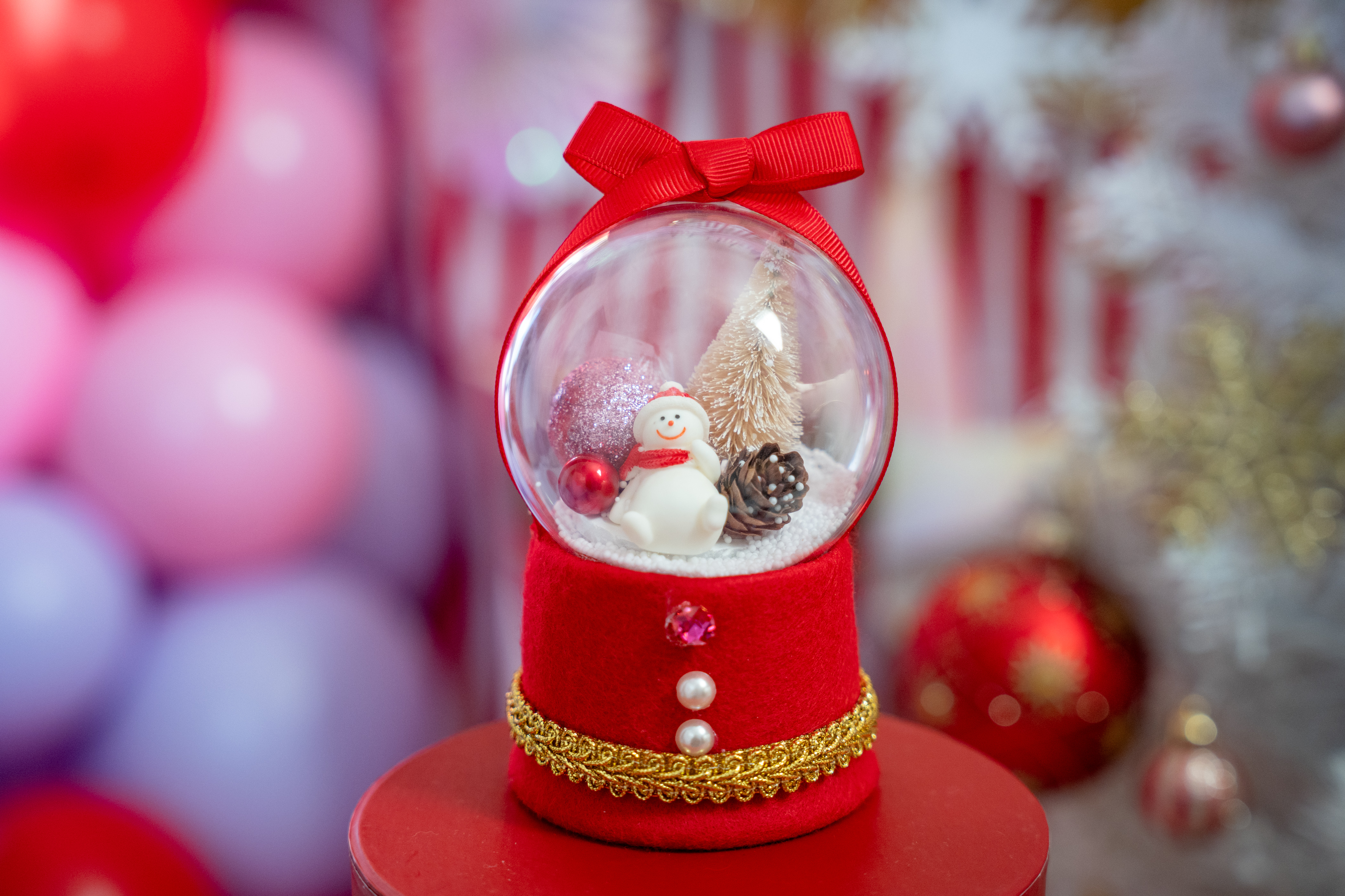 水は使用しません!小さなサンタや雪だるま、ツリーや木の実を選んだら、クリアボールの中にクリスマスの風景を作ります!雪に見立てたビーズを入れて、リボンやパーツで飾ってクリスマスのインテリアを作りましょう!