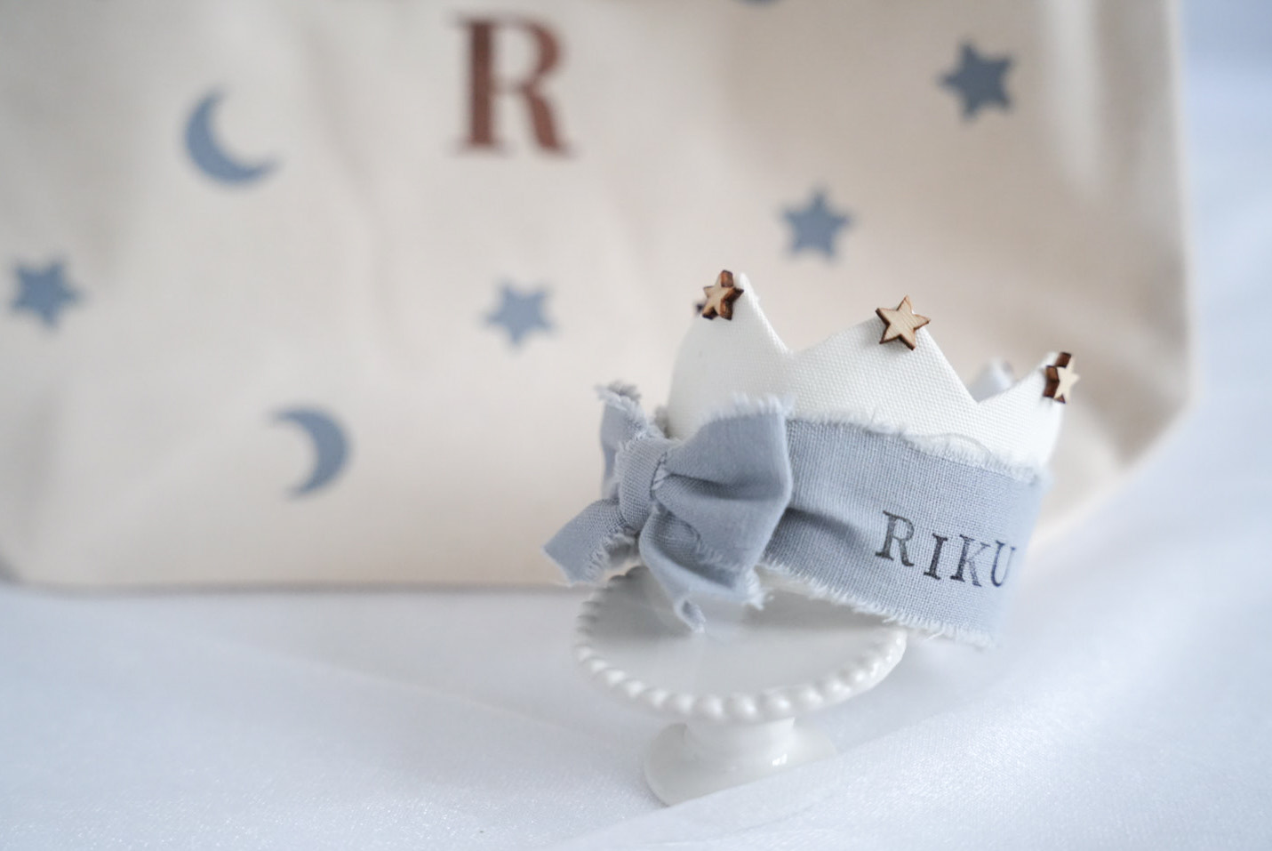 生成り生地で作られたクラウンに好きな色のリボンやパーツを飾り、お名前をスタンプで入れられます(無料)。クラウンは完成品をご用意するので簡単に作れます。