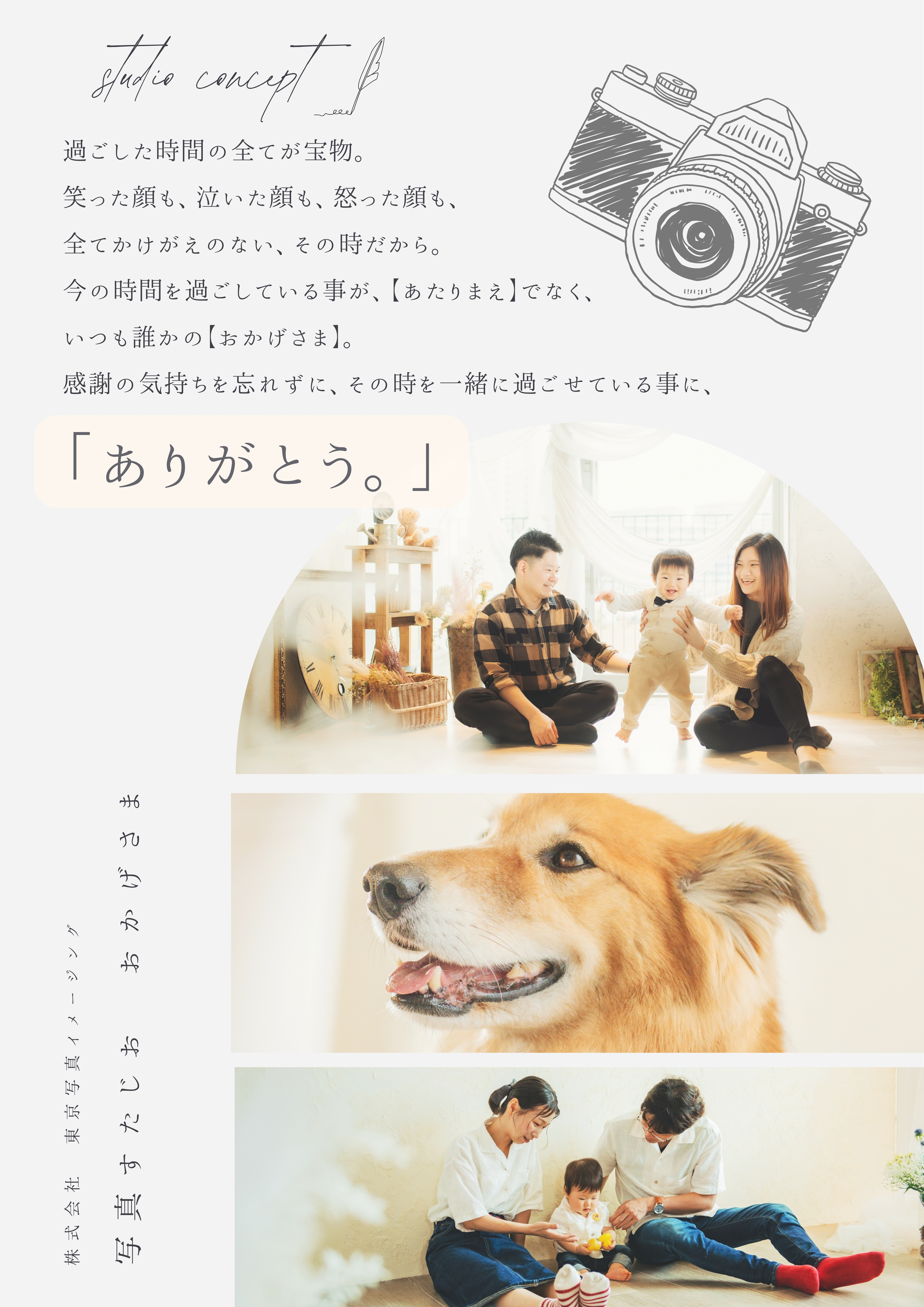 ご家族様でも、ワンちゃんと⼀緒でも撮影可能です。狙ったカメラ⽬線のお写真ではなく、皆様が過ごした10分間を思い出として、写真すたじお おかげさまが形に残します