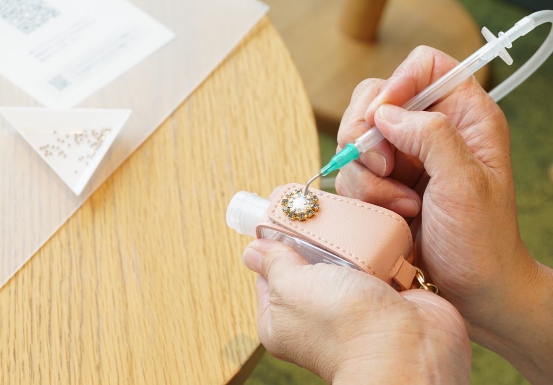 ドンネデコというハンドメイド技法で、キラキラ可愛いコンパクトミラーやアクセサリー、消毒用アルコールジェルケースを作ります!樹脂粘土の上に好きなストーンを配置するだけで簡単に可愛いオリジナルグッズが作れますよ。