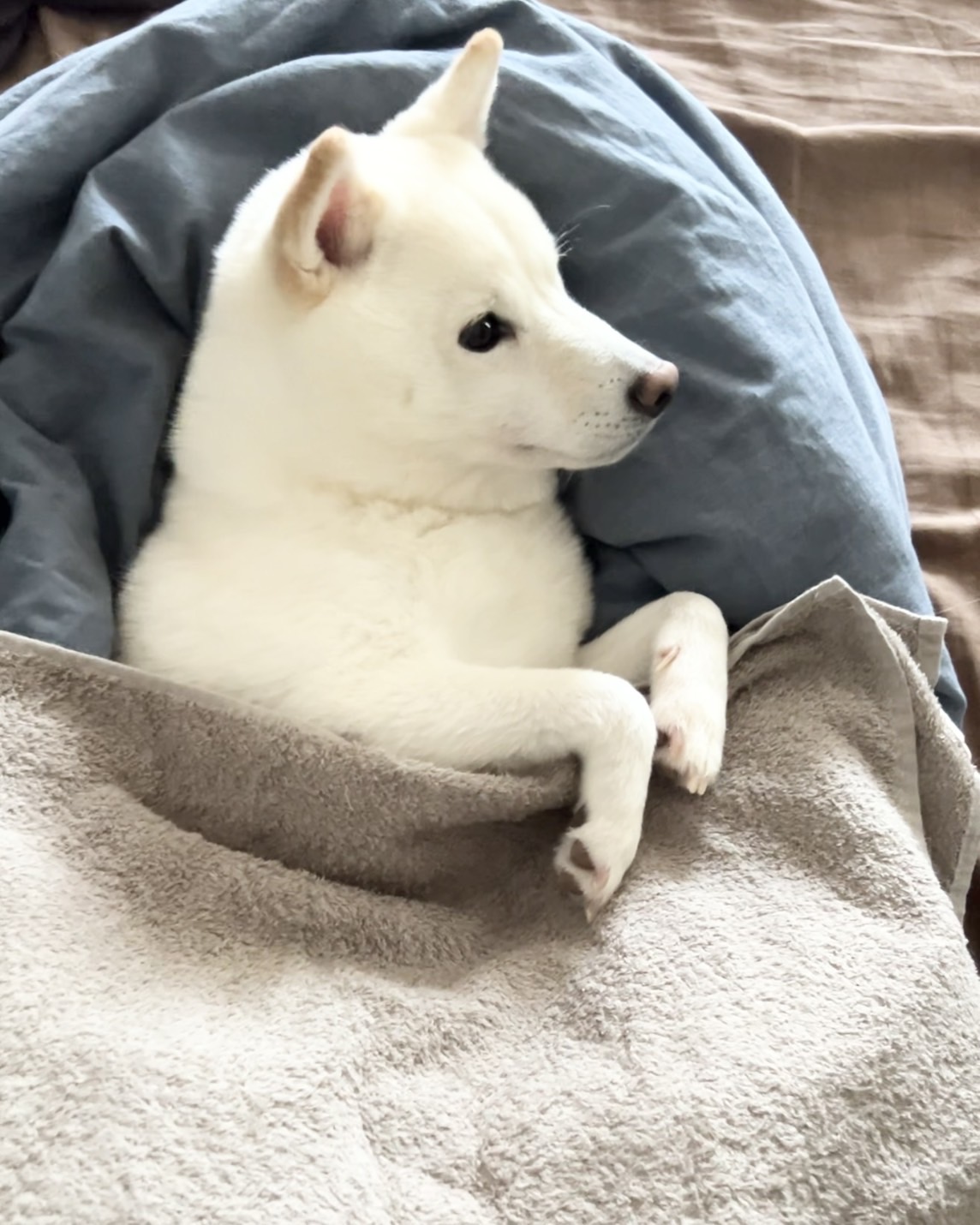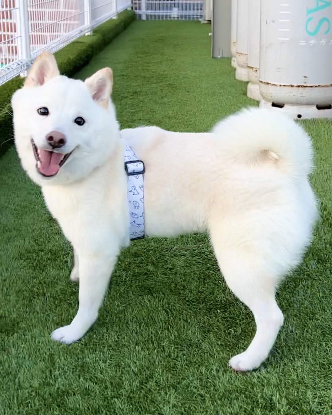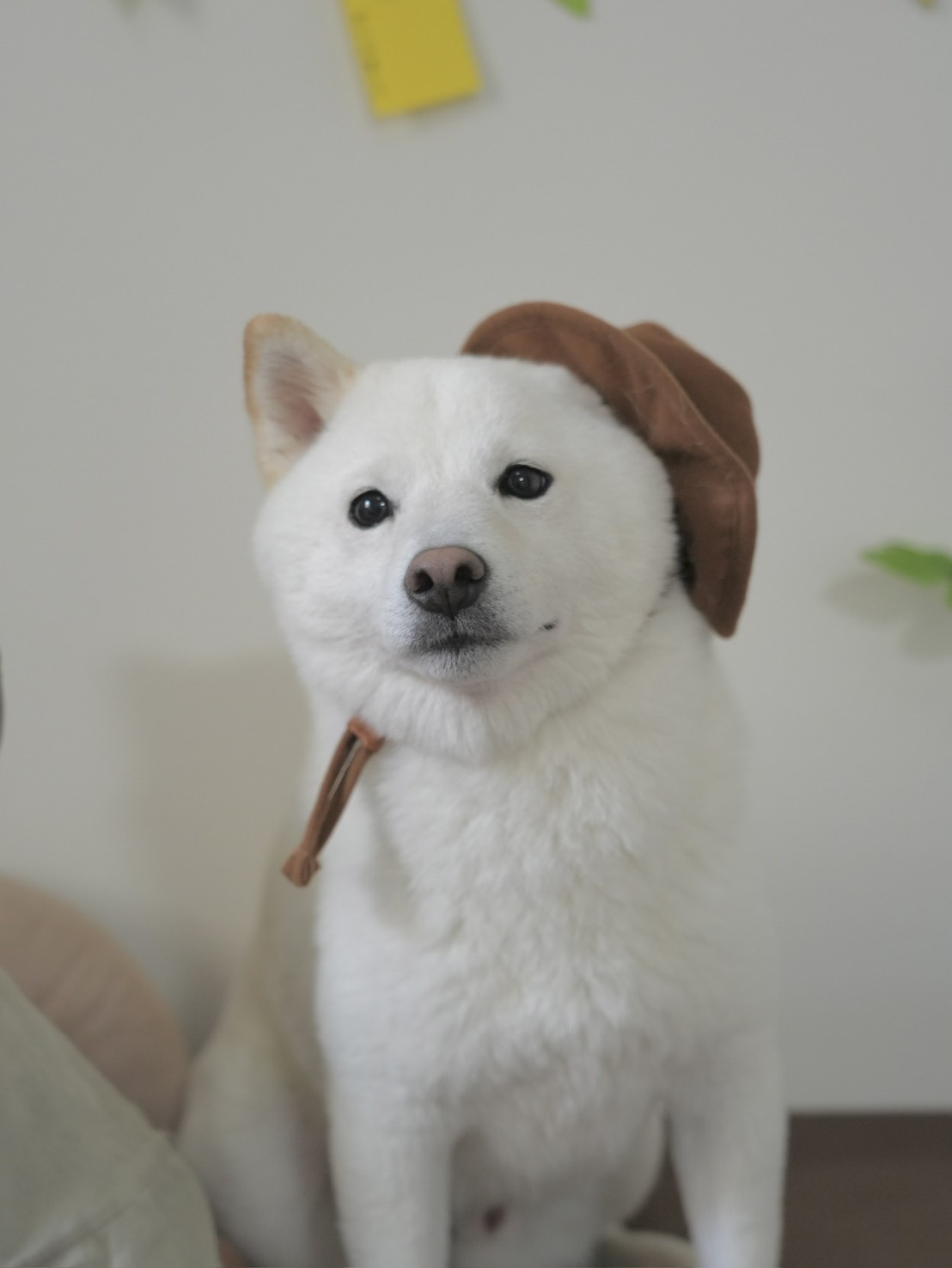 まっしろな毛並みに、耳と背中、ふくらはぎだけうっすら茶色。気分によって現れる“田舎者風”の眉毛がチャームポイント。人も犬も大好きで、感情が高ぶると毛が舞うほどエネルギッシュ。「おて」「おかわり」「おすわり」「ふせ」「ギャルピ」までこなす芸達者な白柴です。「おやつ」「遊ぶ」という言葉には驚くほど素早く反応し、「何食べる?」と聞かれると、まるで人のように「ごはん」と答えることも。