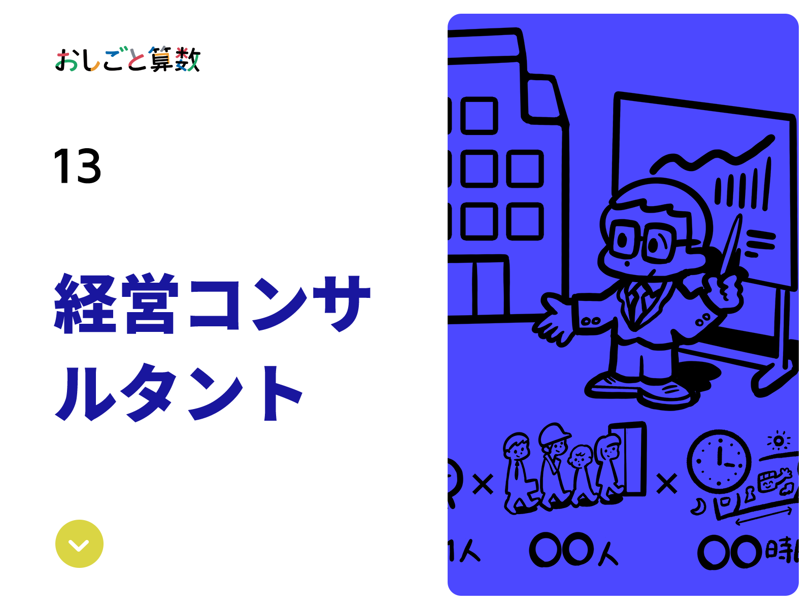 会社の経営状況を独自の視点で分析し、社長に対してアドバイスをする「経営コンサルタント」という仕事。 実は、この仕事で大事なスキルの1つが、小学生で習う「計算式」を自在に使いこなすスキルです。 あのお店はどのくらい儲かっているのだろう?あの商品って日本中でどのくらい売れているのだろう?、という疑問に対して、言葉で計算式をつくり、限られた情報の中で概算するチカラを持っています。 さらに、データから意味を読み取る「統計分析」のチカラや、論理的に相手の納得を生むチカラも兼ね備えているのが経営コンサルタント。子どもコンサルタントのもとにやってくる様々なミッションに挑戦しながら、どんな仕事にも通じるそれらのチカラを磨こう!