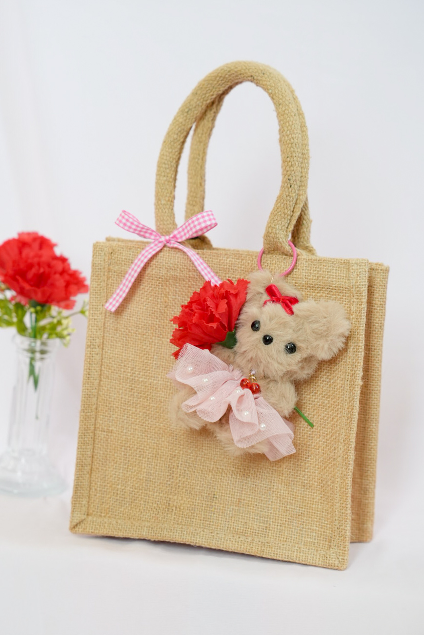 作ったくまちゃんは、チャームにしてバッグに付けて仕上げます!カーネーションの造花も添えて、ママも喜ぶプレゼントの完成!!お子様が作った愛らしいくまちゃん付きのバッグは、きっとママが喜ぶプレゼントになりますよ!プレゼントするときはバッグの中にお手紙やお菓子を入れても良いですね!