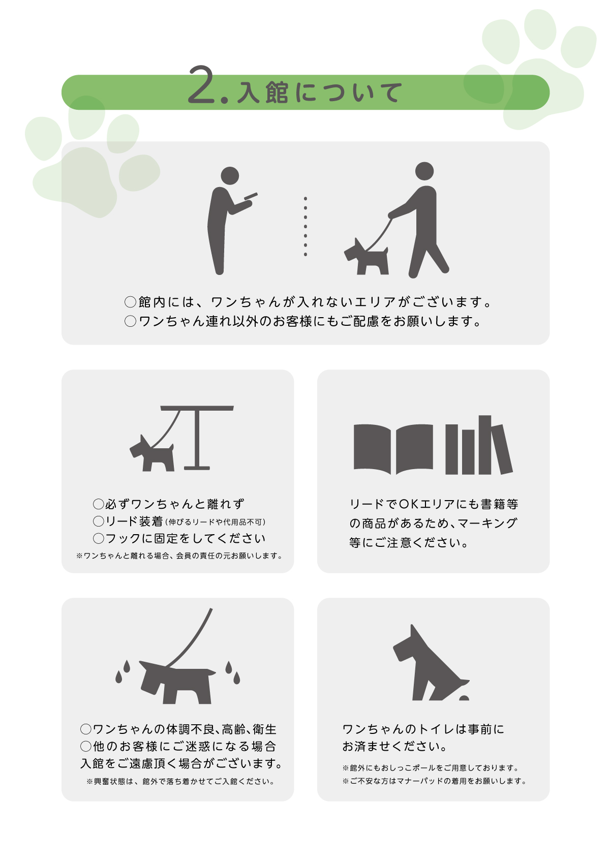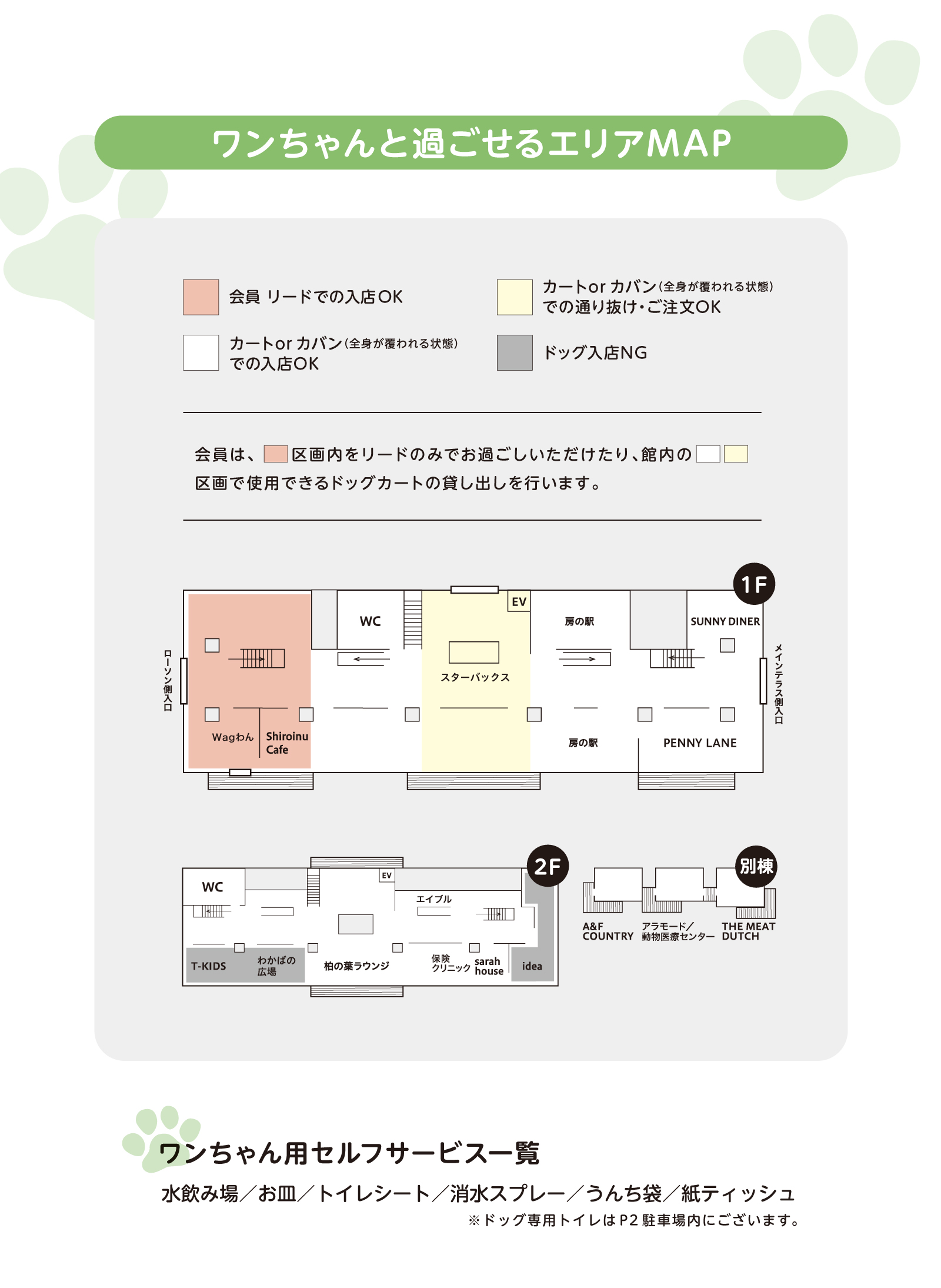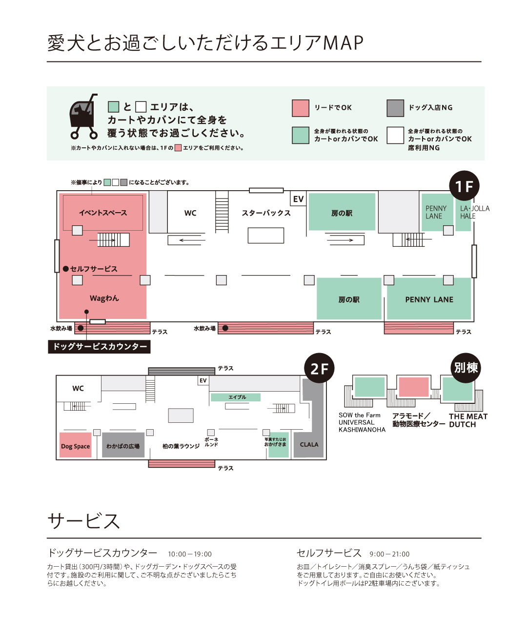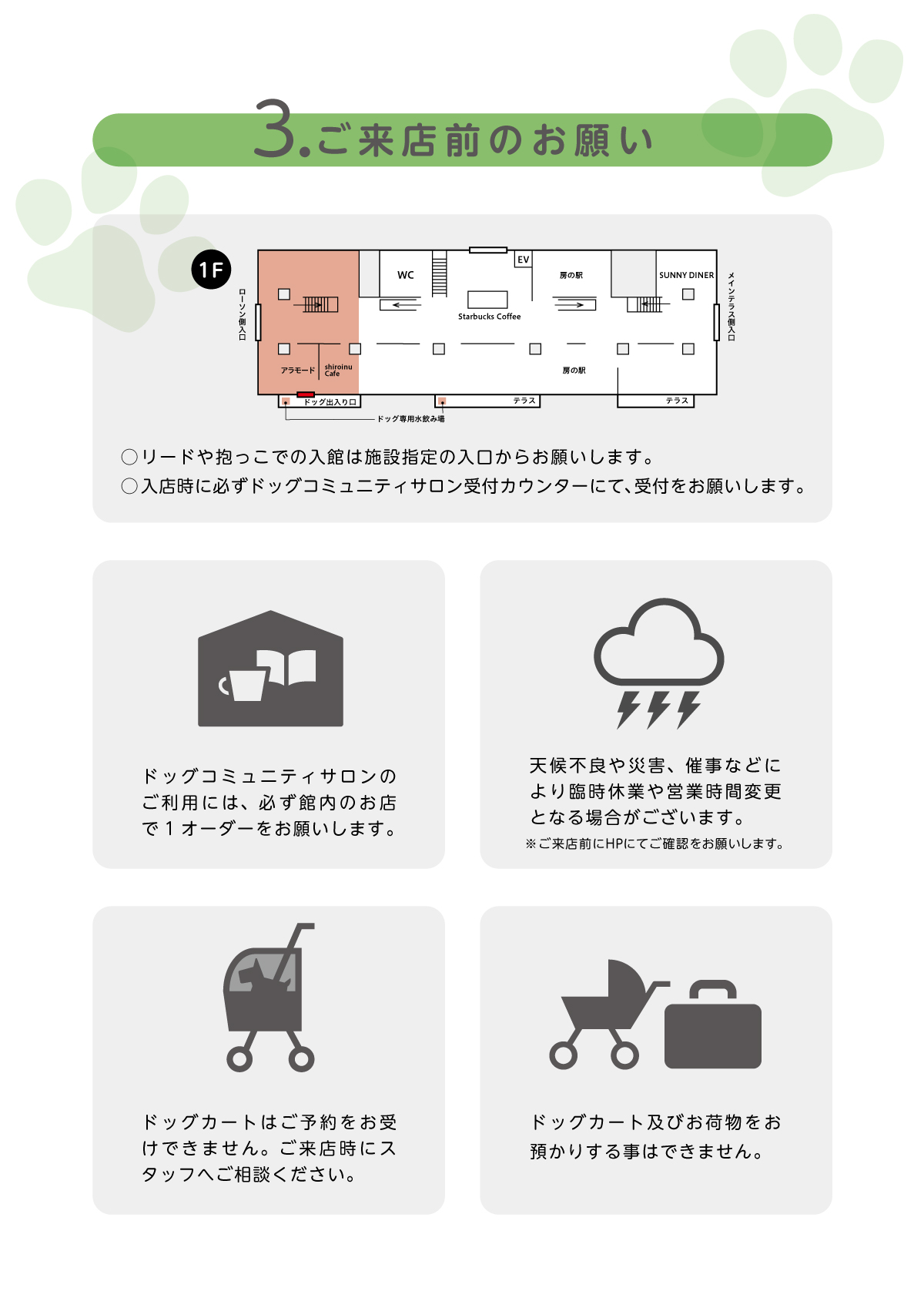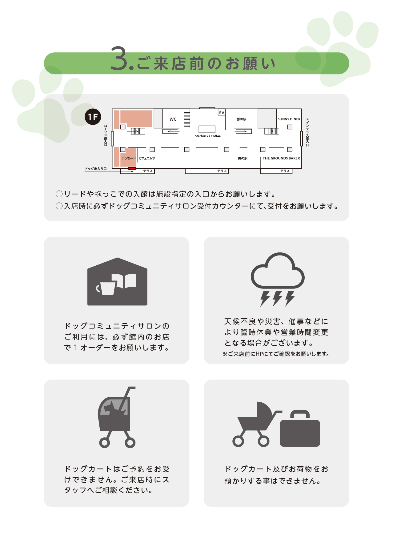 【DOG FRIENDLY SERVICE】施設利用に関するご案内 カートやカバンでのご入店や、一部エリアをリードでお過ごしの場合は、 必ず、以下【ワンちゃんとお越しのお客様へお願い】をご一読の上、ご来館ください。 ドッグフレンドリーサービスHP