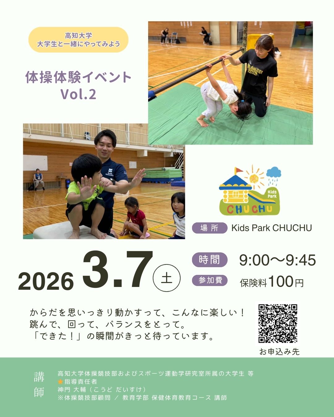 高知大学体操競技部のみなさんと一緒に、体操を体験してみませんか。