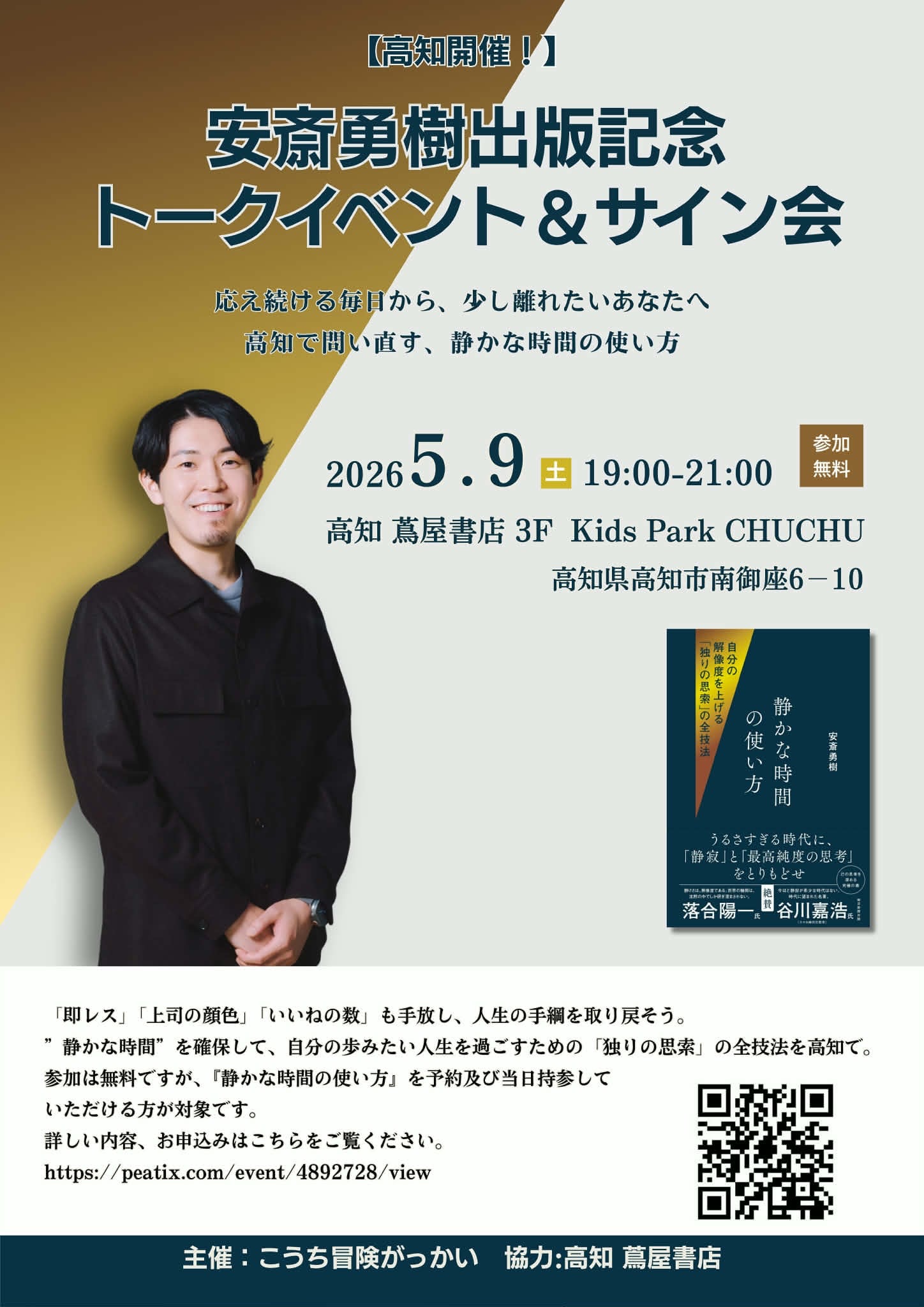 今回の出版記念トークイベントでは、『静かな時間の使い方』の全技法について、ここ高知で実践的な内容を語っていただきます。