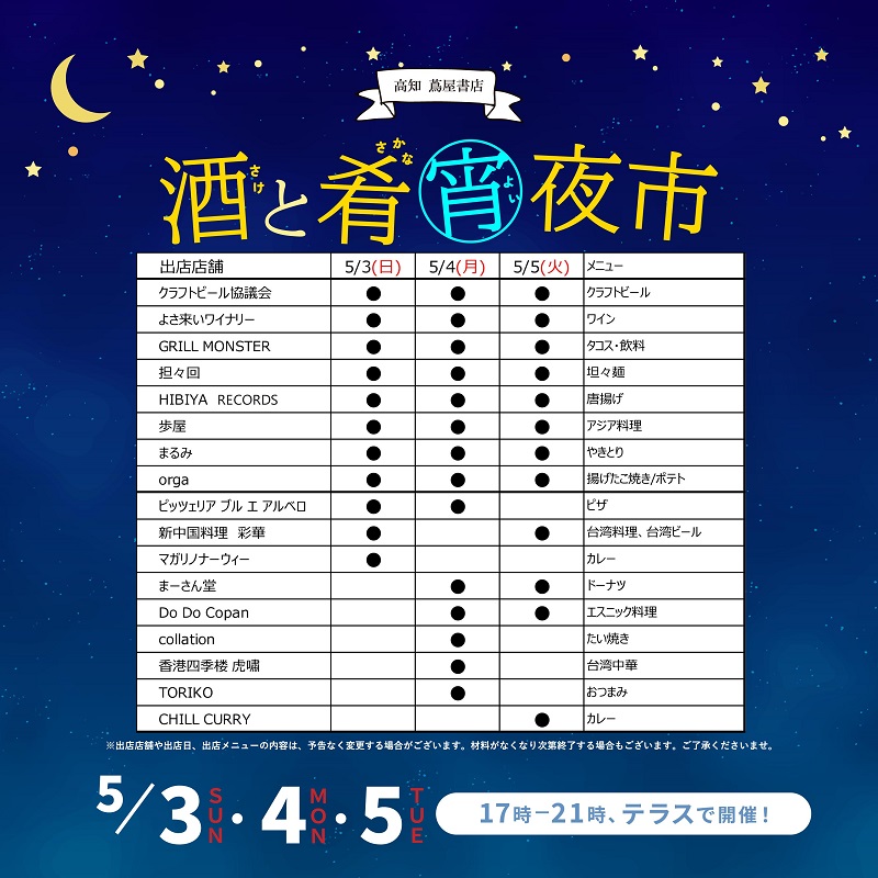 今年もゴールデンウィークの夜市は 酒と肴がテーマの大人の夜市です!!