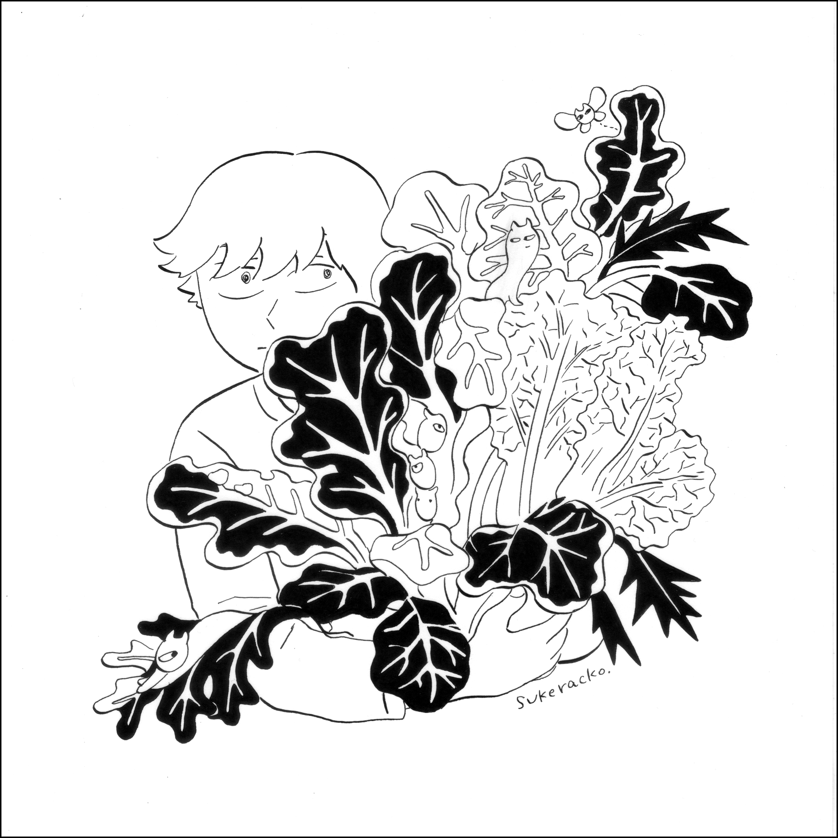 「Leaf vegetable」(2025年) 210×210mm、ケント紙に墨汁、顔料インク