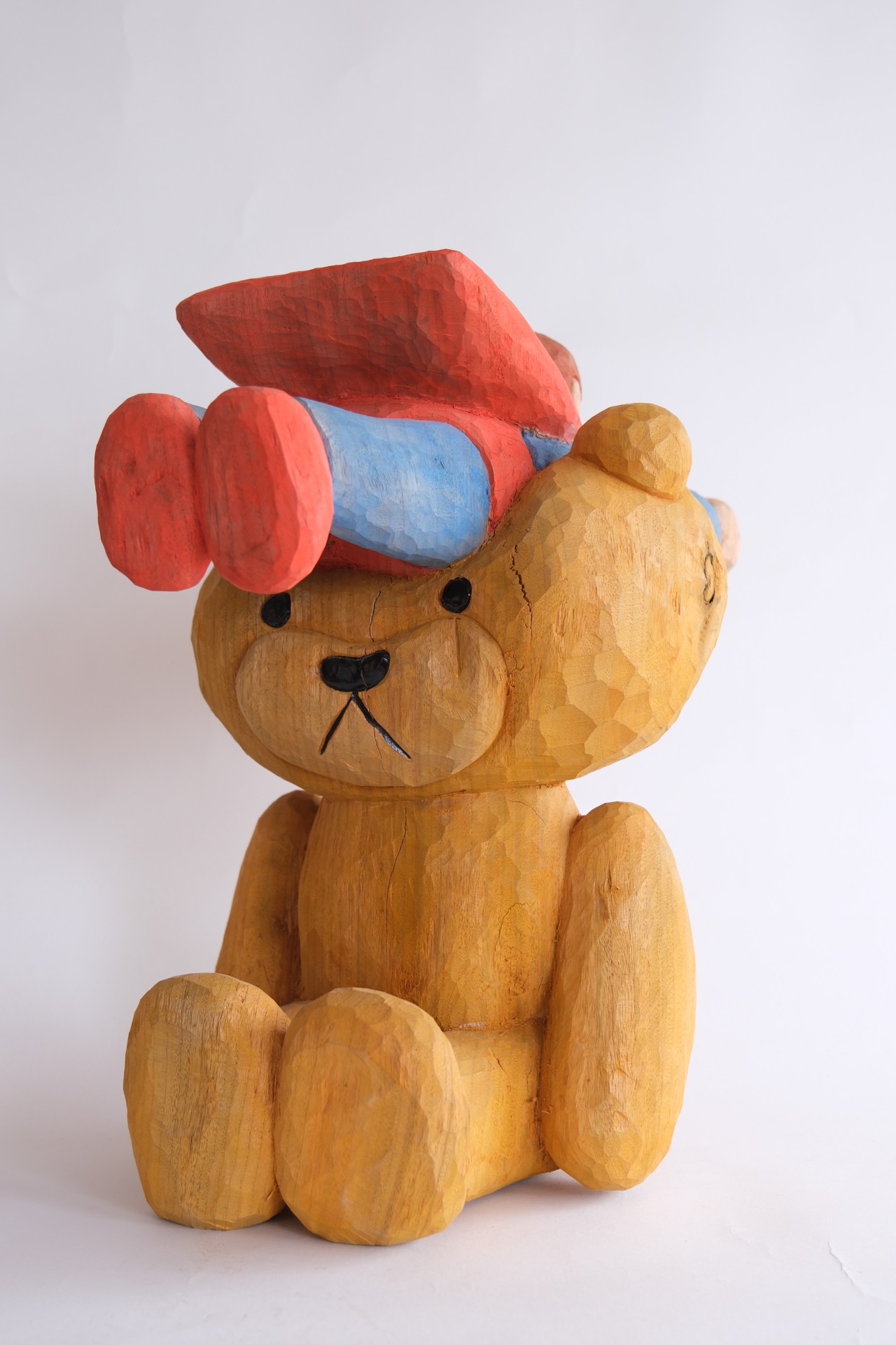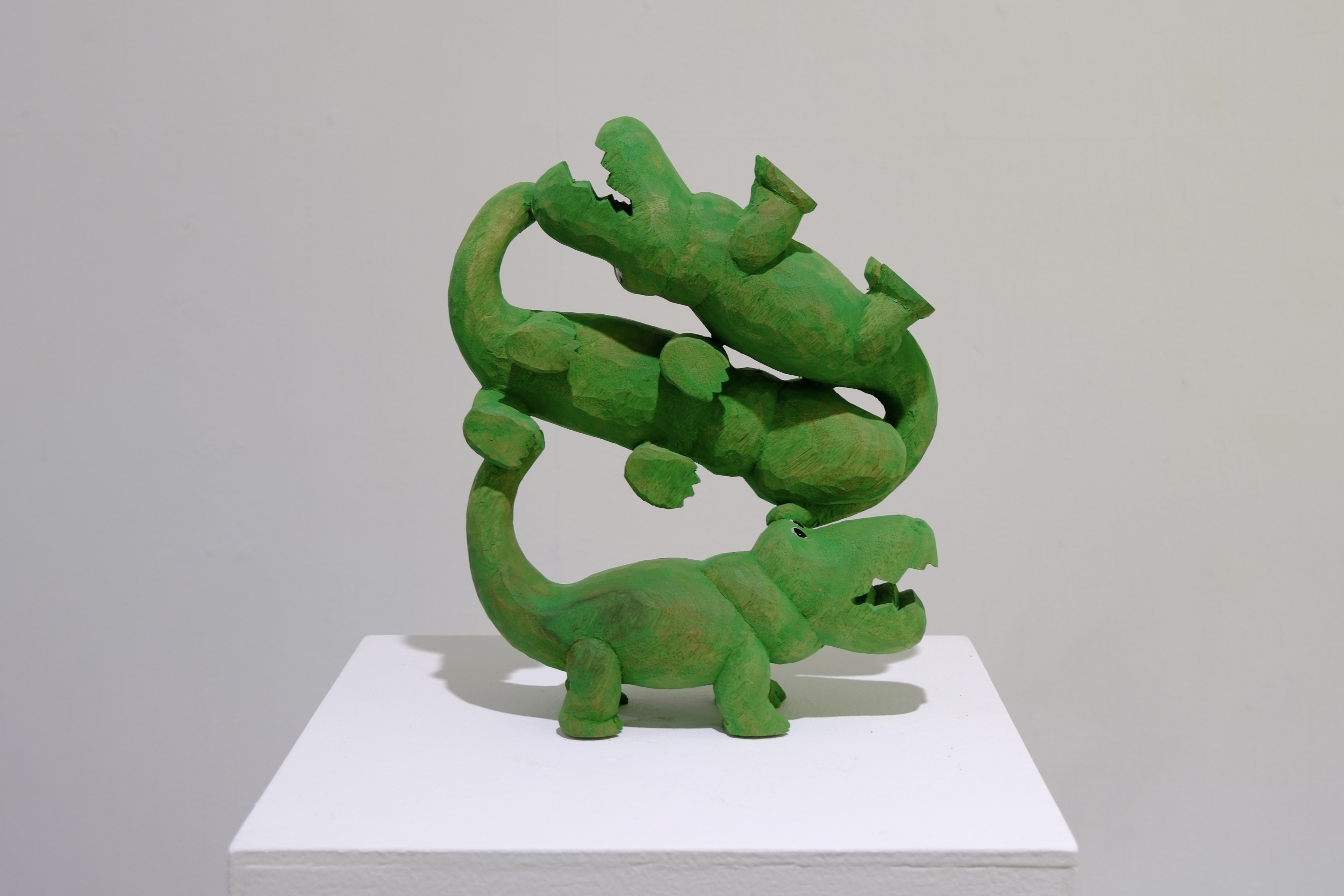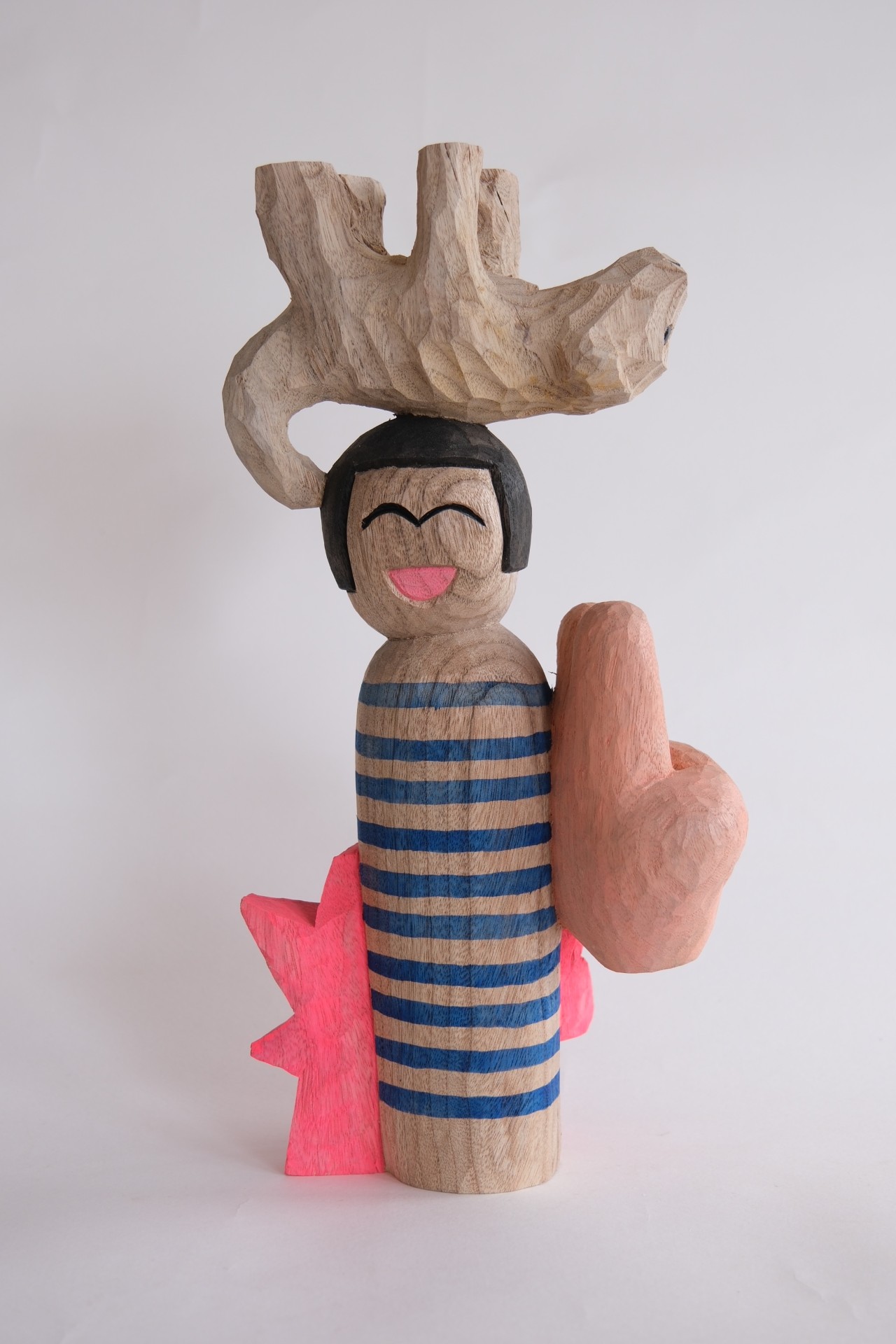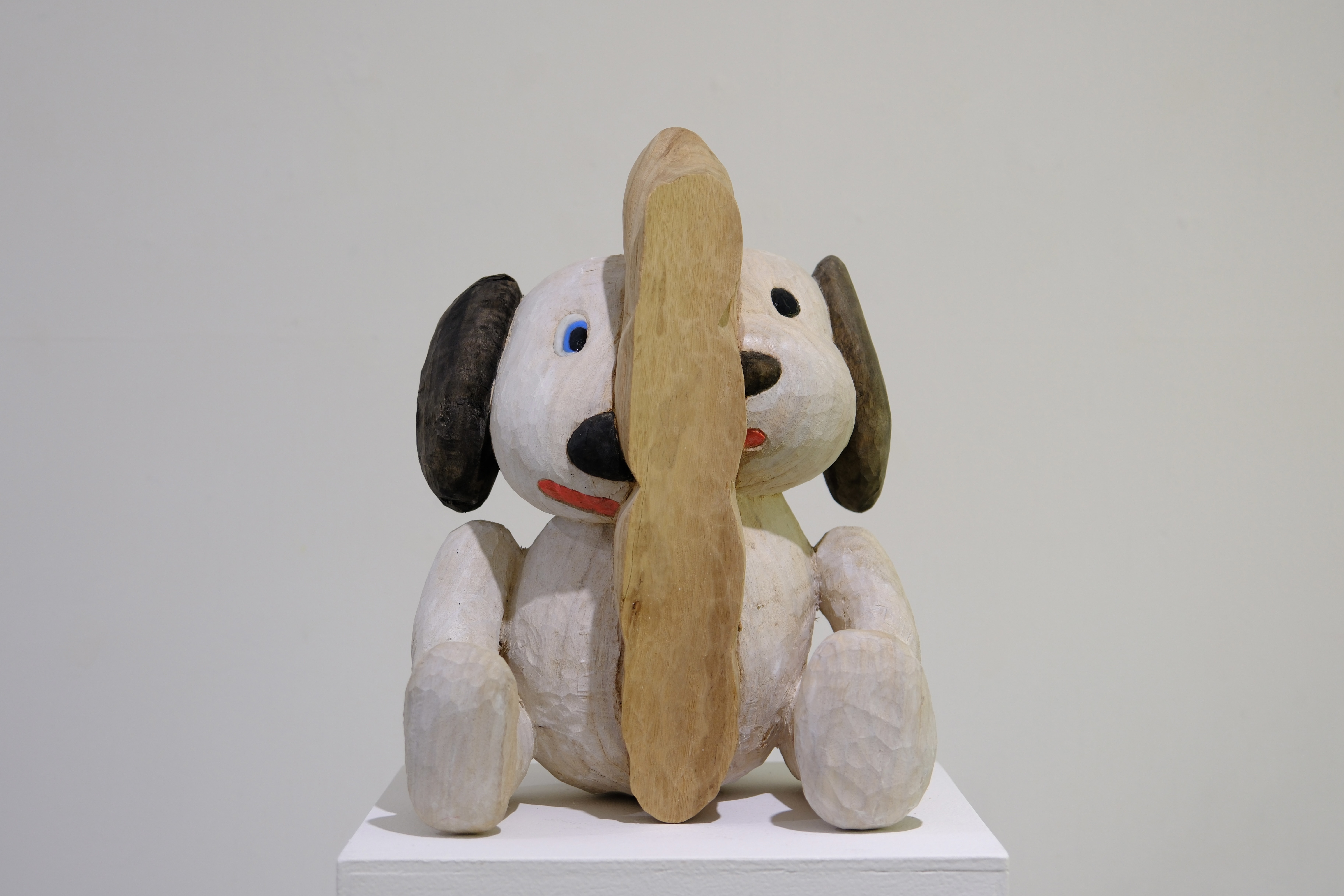 北浦和也の彫刻作品は、主に木材を用いて1つの木塊から作品を彫り出し、リズムを感じる彫り跡と、ポップな色彩を重ねて作り上げられます。誰もが知っている郷土玩具や童話、SF・ファンタジーの世界に登場する動物や人物に、一見すると無関係に見えるものを組み合わせて作られるユニークな造形は、モチーフに新たな関係性やストーリーを生み出し、観る者の想像力をかきたてます。