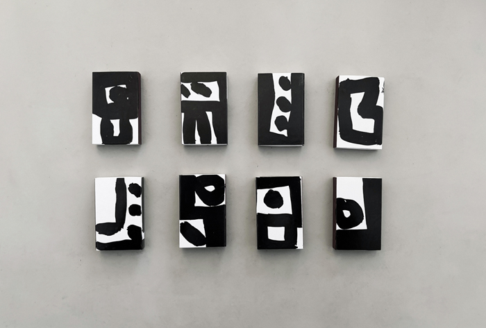 3つの版のいずれにも黒のインクを使用する「トリプルブラック」という技法で印刷した大判作品集。黒のインクを3回重ねることで、墨に劣らない力強さが生まれています。『点点』(2017)、『BOTTLE,APPLE』(2018)、『CHROMONO』(2019)といった個展で発表した過去作と、作品集のために描き下ろした作品を収録。年代やシリーズをあえて分類せず、大胆に拡大やトリミングをしてレイアウトしています。