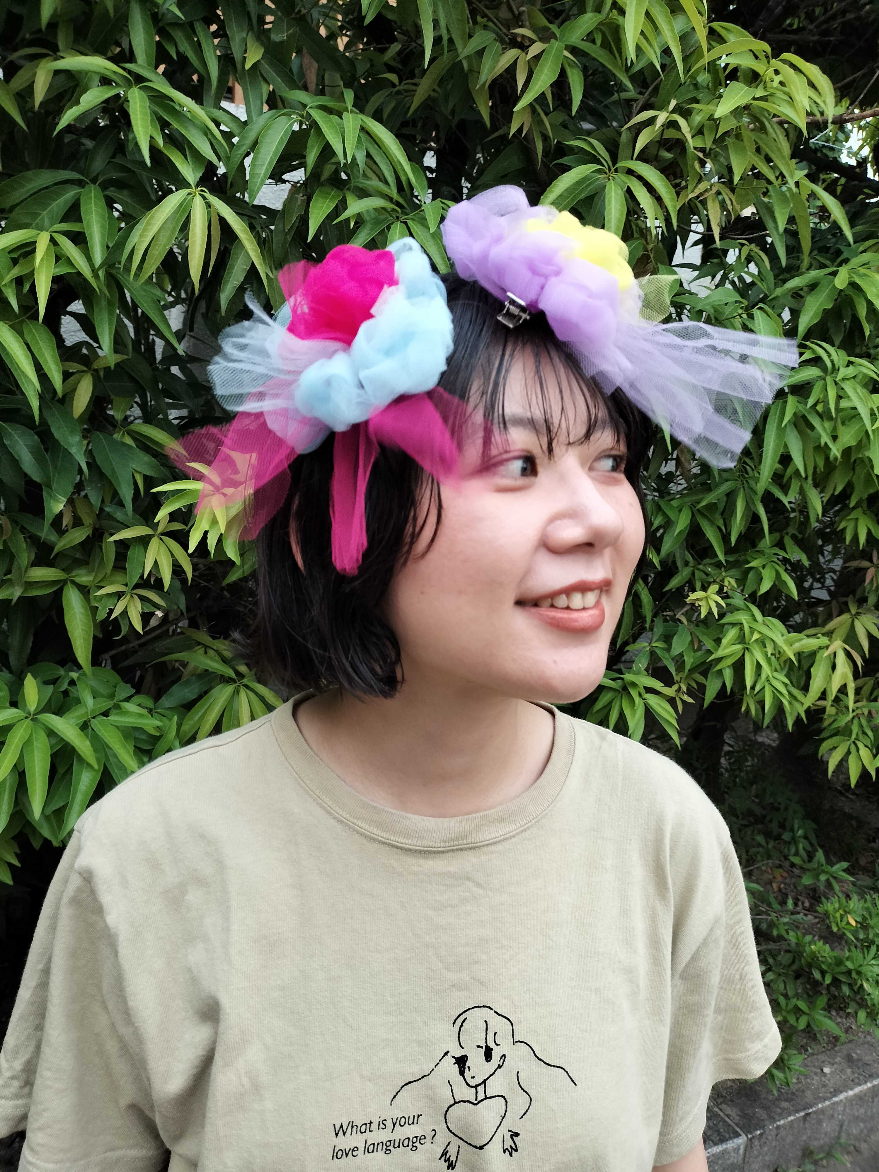 指でフワフワのチュールリボンを編みます。